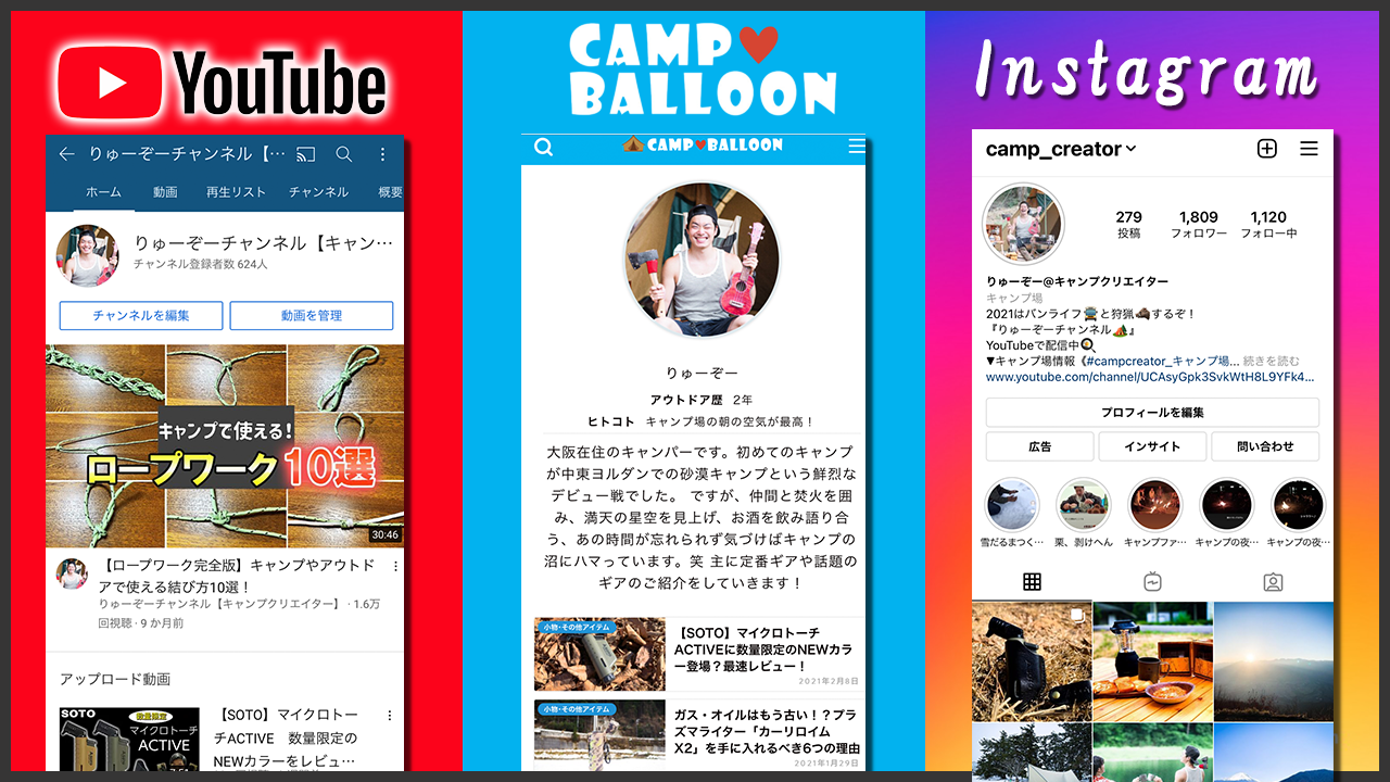 現在自称キャンプクリエイターと名乗り、キャンプの情報をYouTubeやwebメディアでライターとして発信しています。