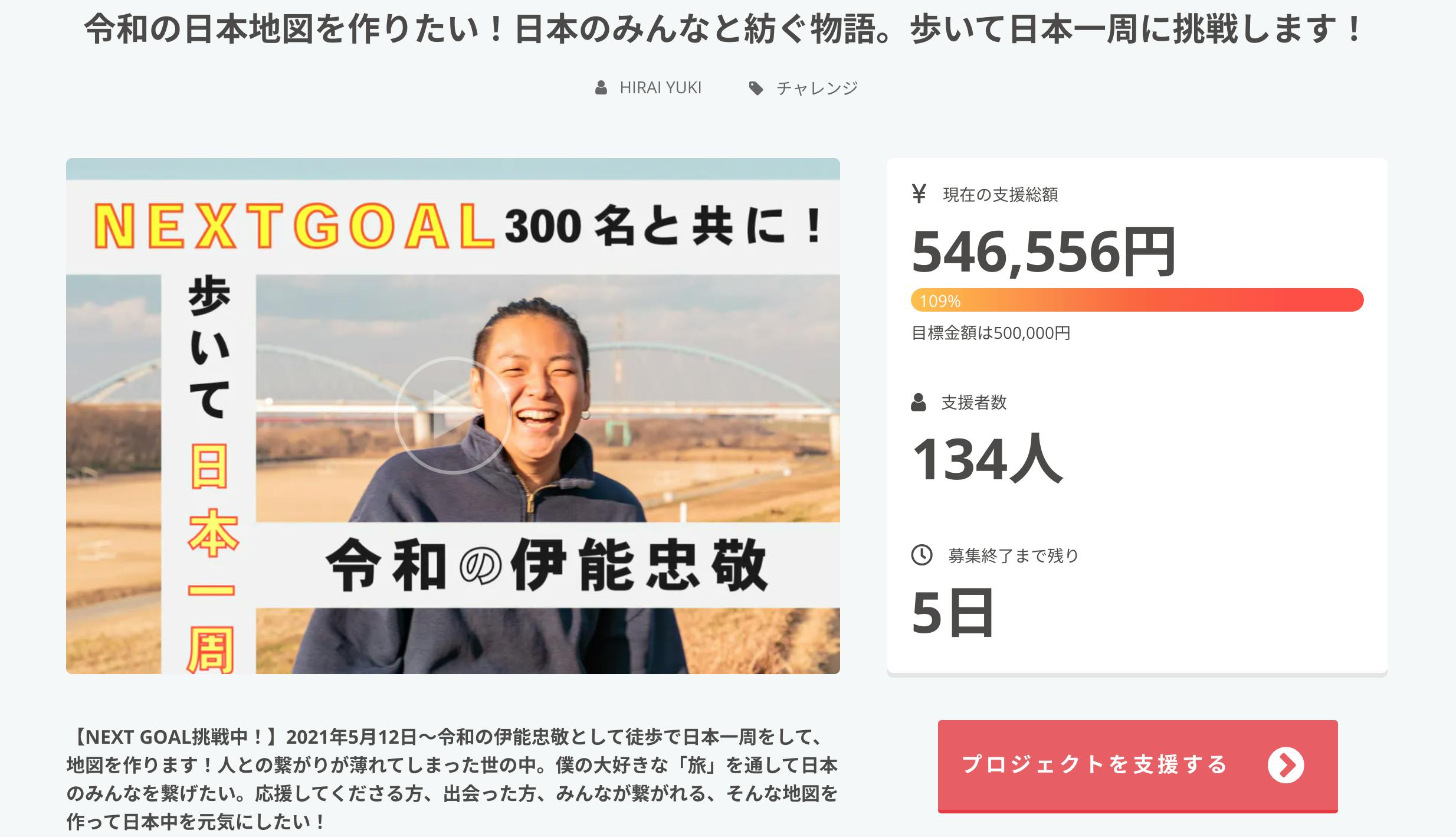 2021/05/11 20:08みなさん、こんにちは!「令和の日本地図を作りたい!日本のみんなと紡ぐ物語。歩いて日本一周に挑戦します!」プロジェクトオーナーの平井佑樹です。プロジェクトの目標金額50万円を達成したので、ご報告させていただきます。ご支援・応援本当にありがとうございました。残り5日にして131名の方にご支援していただけることになりました。そして、今回ネクストゴールとして「300名の方に支えていただく」ことに挑戦します。なぜ、金額ではなく人数なのか?それは僕の大好きな旅を通して日本中の人を繋げたいからです。もっともっと多くの方に、笑顔を、元気を、勇気を届けたい。そんな思いで残り5日間ネクストゴールに挑戦します!もしよろしければ、友人の方や周りの方、SNSでの拡散などご協力いただけると嬉しいです。クラウドファウンディングはゴールではなく、スタートラインです。緊急事態宣言下ですが、明日から東京駅を出発し、皆さまの想いを背負い、2年間をかけて歩いて日本一周に挑戦します。これからも応援していただけると嬉しいです。どうぞよろしくお願いいたします。 もっと見るAconcagua様からリュックサックの協賛をいただきました!
