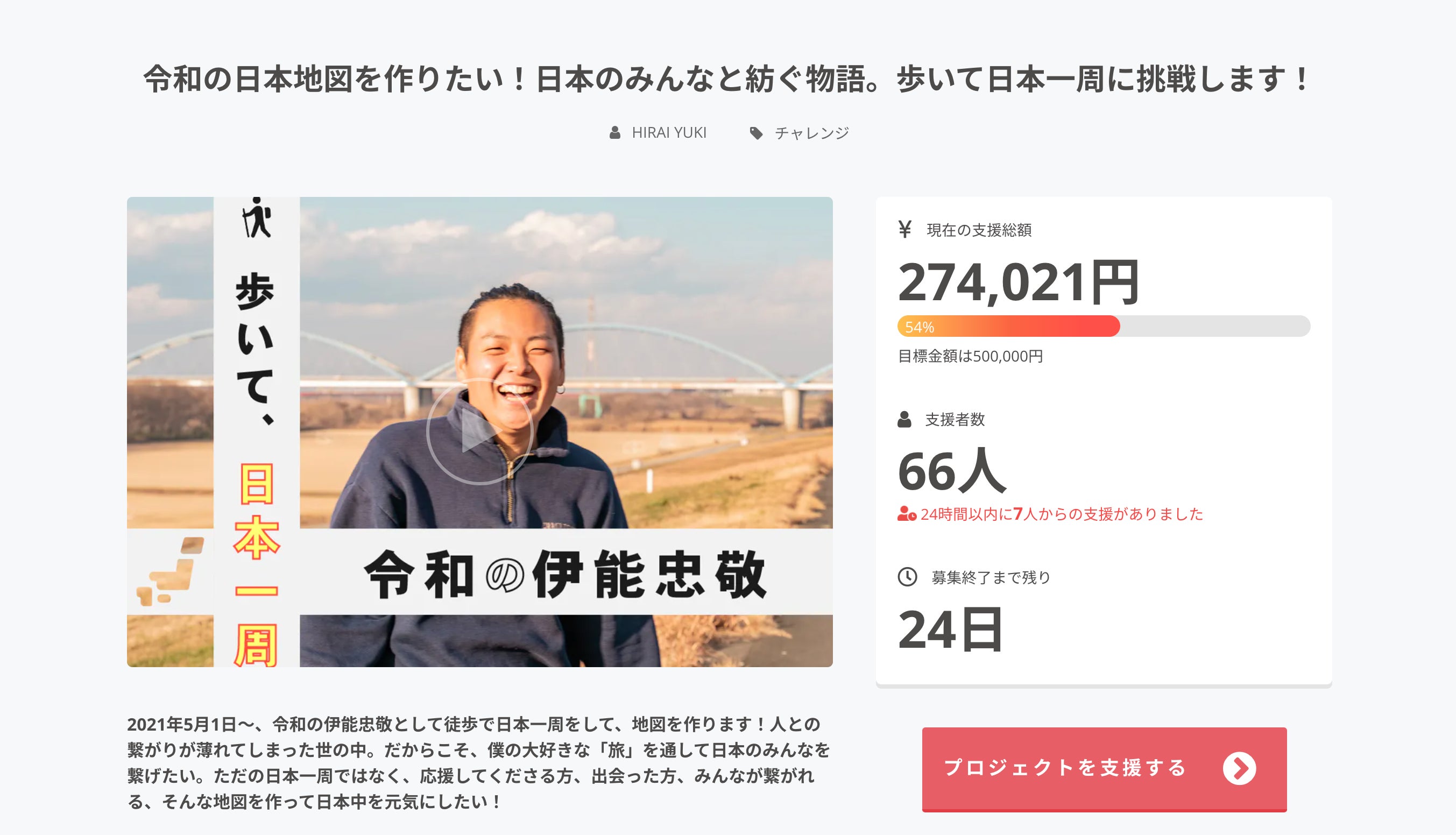 50万円に到達すると、クラウドファウンディングは成功します。しかし、僕の本当の目標は300人の方を巻き込むこと。今できること全てに取り組み、50万円を絶対に達成し、300名の方に日本の魅力を、元気を届けます。