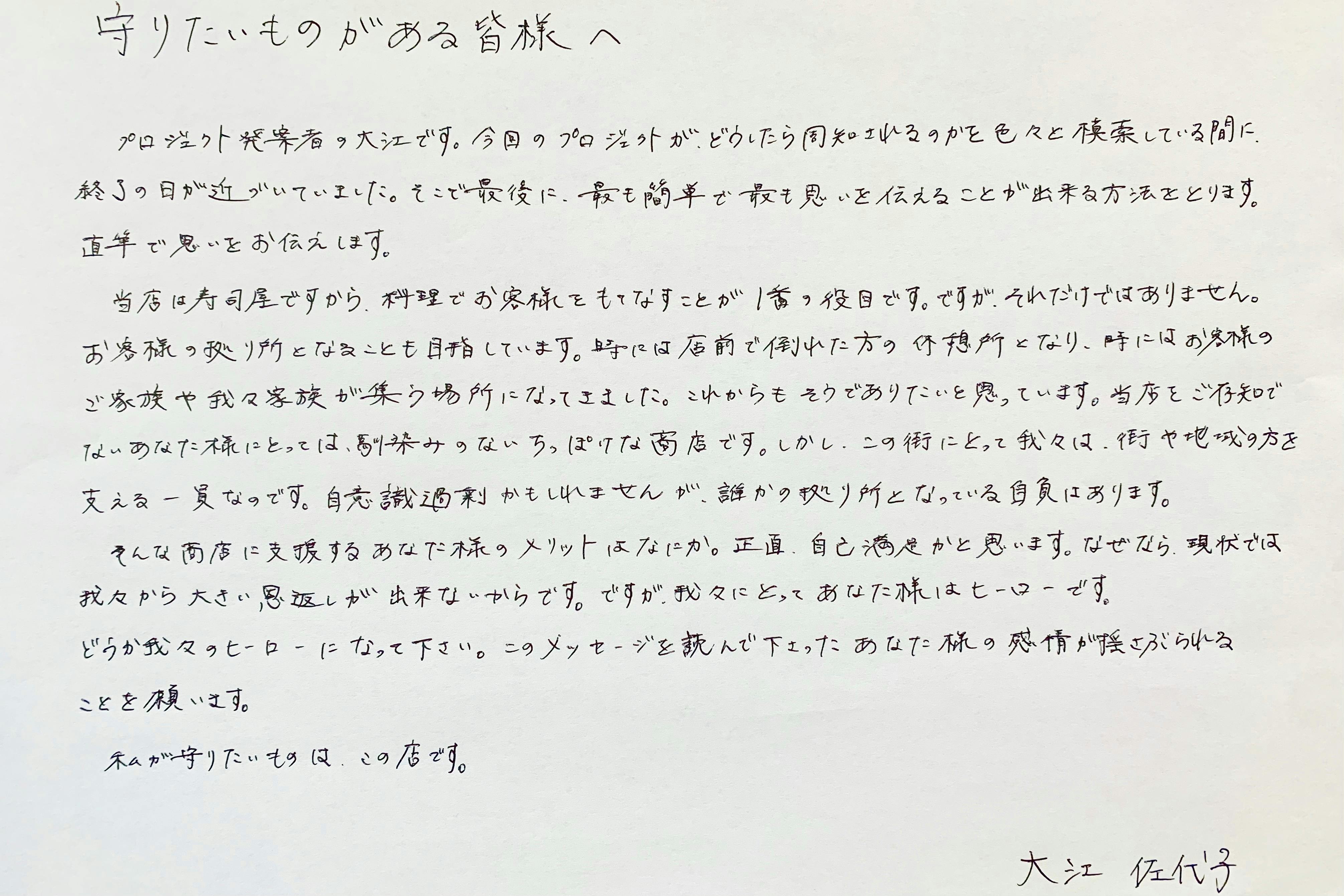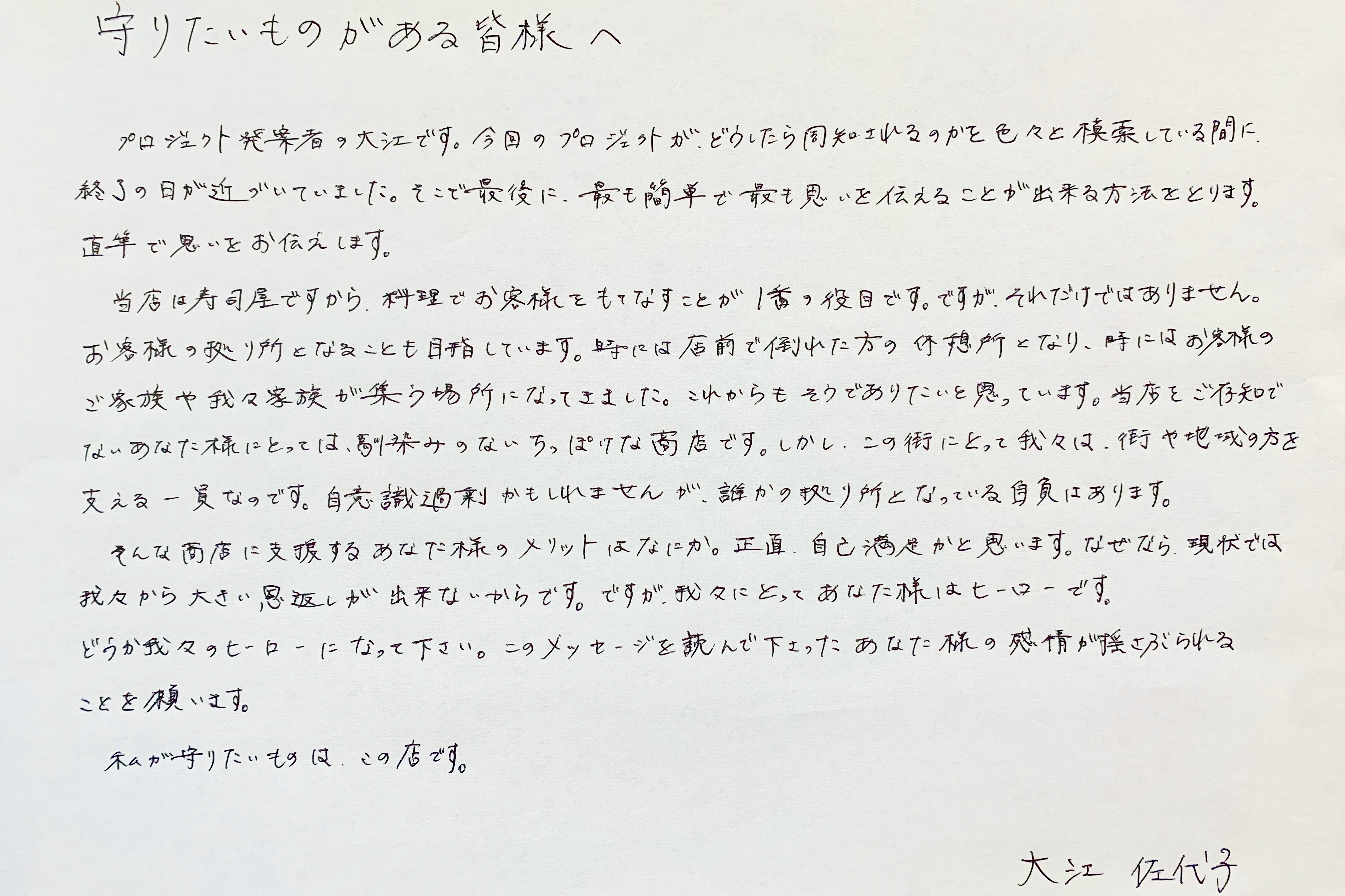 2021/04/26 07:26昨日でプロジェクトが終了致しました。ご支援いただいた皆様に、心より感謝申し上げます。ありがとうございました。プロジェクトは達成となりませんでしたが、多くの方々に気にかけていただきました。ご近所さんとの新たな繋がりや、新しいお客様との出会い、ネット上での応援など、弊店の未来に繋がるものを得ることが出来ました。少し甘いかもしれませんが、得るものが大きかった分、今回のプロジェクトを行った意味はあるのかなと…。皆様1人ひとりの優しさや世間の優しさに触れ、より一層弊店の存続に力が入るばかりです。プロジェクトは一旦終了しますが、我々はまだ挑戦の足を止めません。まだまだ存続の為の試行錯誤を行います。恐縮ではありますが、そんな弊店をこれからもどうぞ見守って下さい。何卒よろしくお願い申し上げます。皆様に深く感謝申し上げて、終わりたいと存じます。誠にありがとうございました。大江佐代子 もっと見る残り1日!!