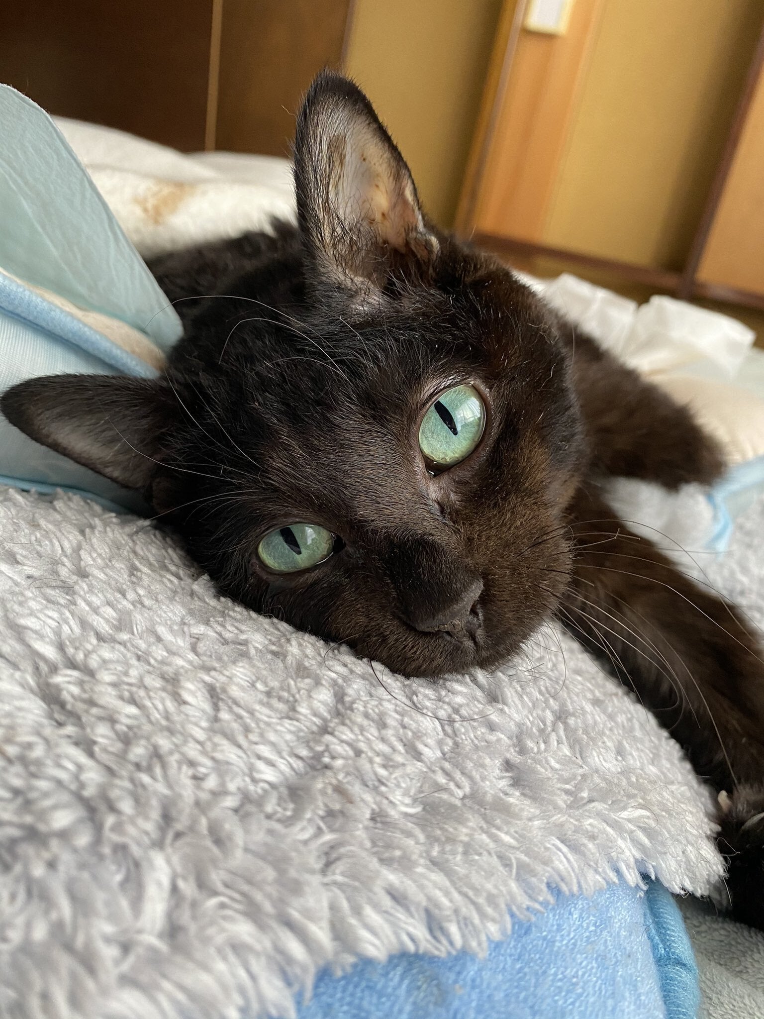一日中お布団で過ごしているので、ブランケットがズレていたら、自分の口で上手に引っ張ります。特技は、瞬間布団かぶり!隠れてしまいます(੭ु´・ω・`)੭ु⁾⁾。