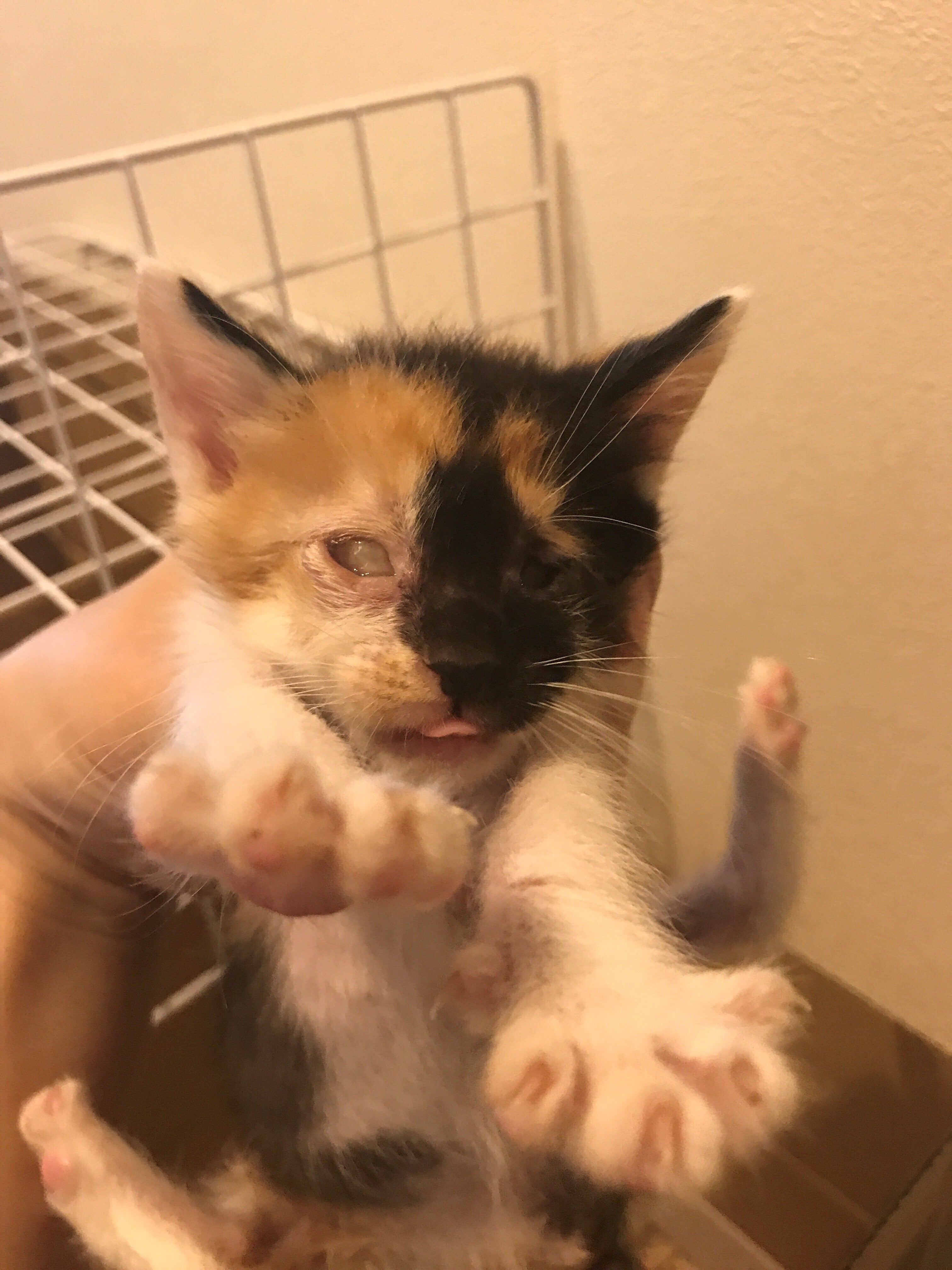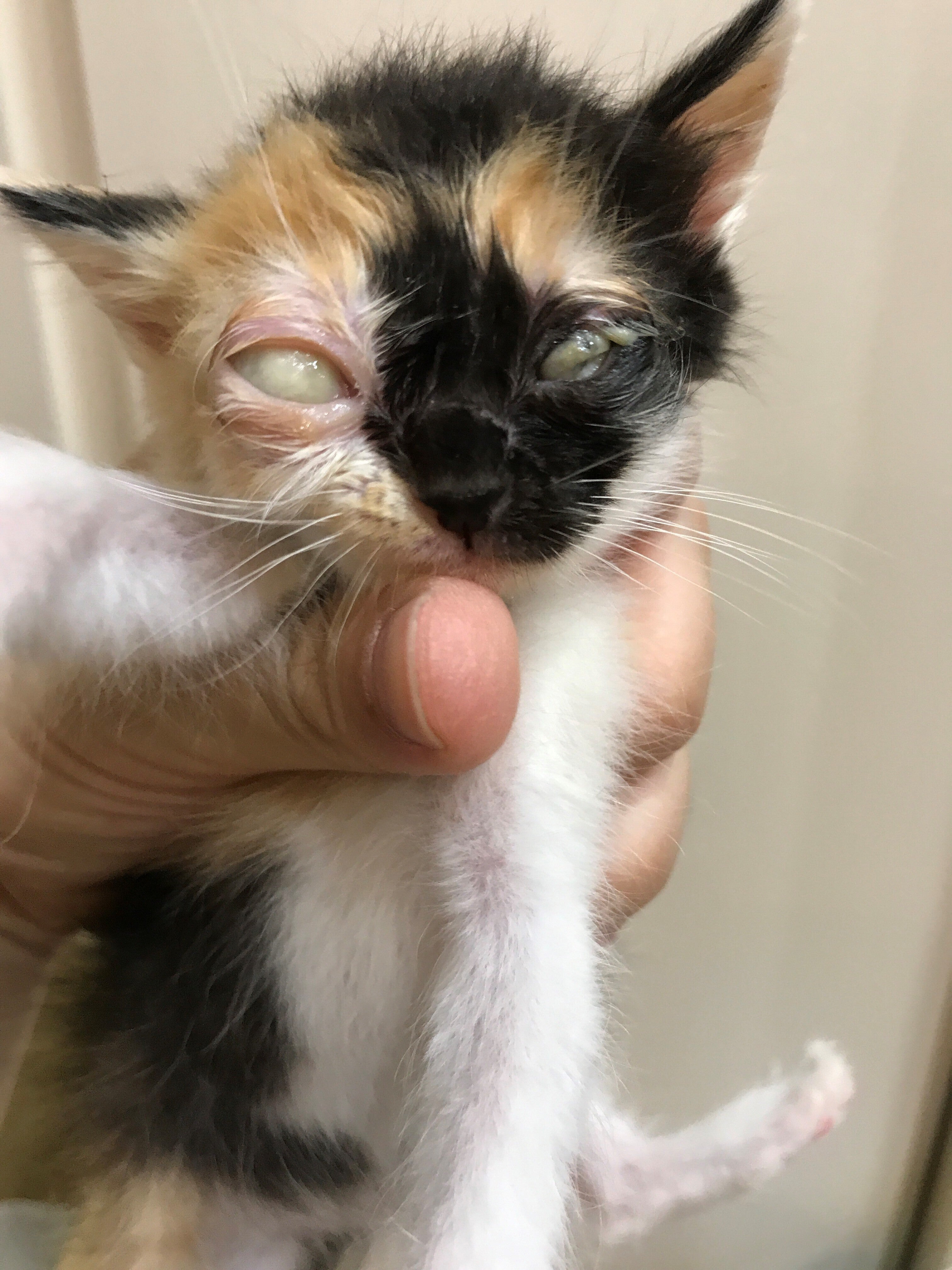 つむぎさんは、今でこそ元気いっぱいに走り回るレディですが、保護された時はひん死の状態でした。恐らくカラスに襲われたものと思われ、両目は完全に潰されました。こちら↓は初めて公開する写真となります。苦手な人、ごめんなさい…。