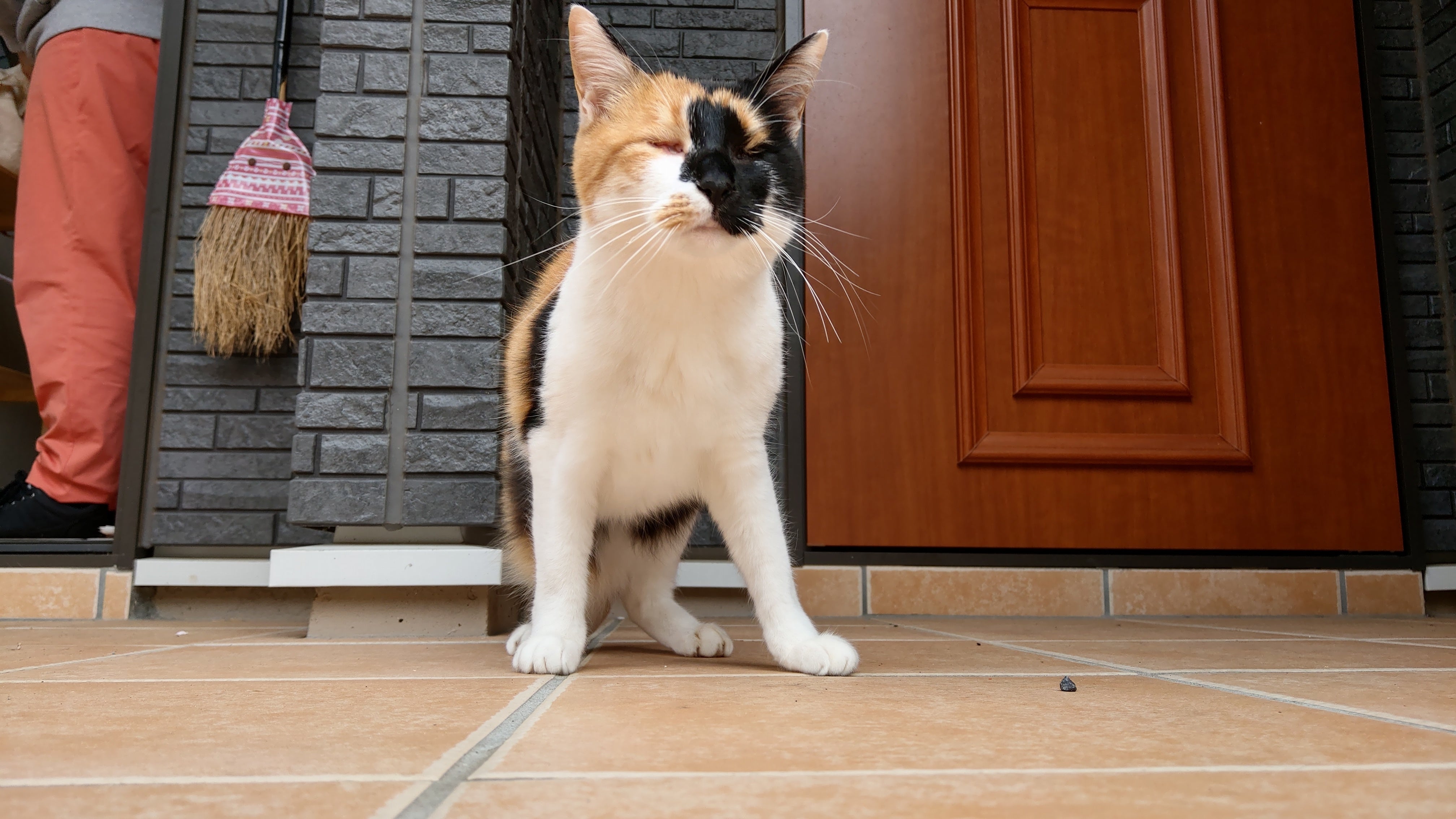 今では華奢な身体からは想像もつかない猫パンチを身に着け、集中力が増すと「座頭市モード」で、もう一匹の猫いとちゃんをタジタジにさせます。