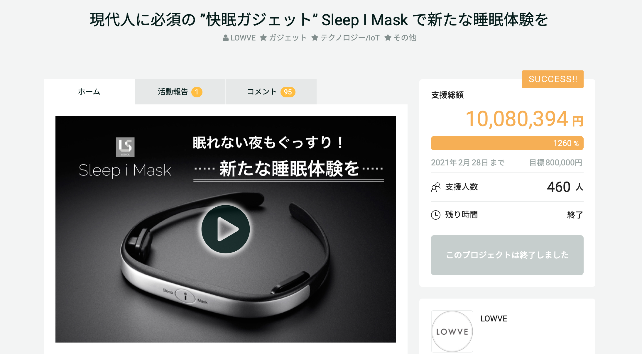 2021年2月に他社クラウドファンディングにてSleep i Maskの最初の先行販売を行い、1000万円以上の支援金を集めることに成功しました。