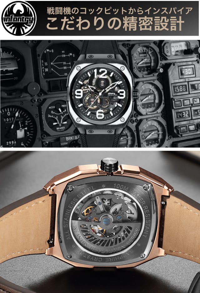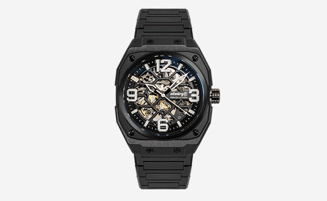アビエーションエレメント(戦闘機ジェットエンジン)にインスピレーションを受けた特別仕様の自動巻きスケルトンムーブメントとローターは細部まで精密に作り込まれており、所有欲を満たしてくれること間違いありません。