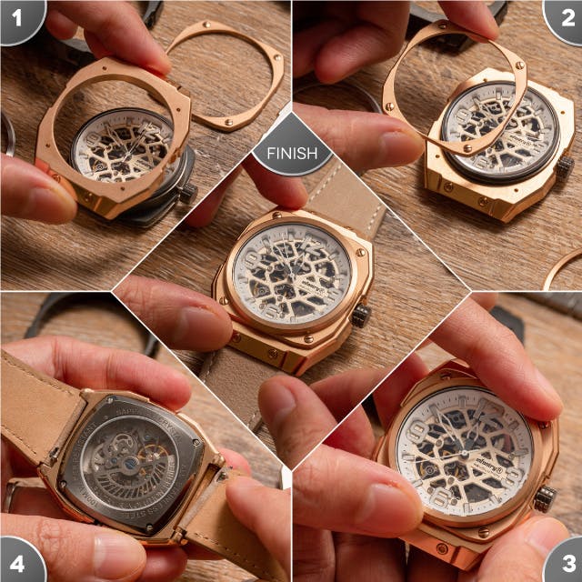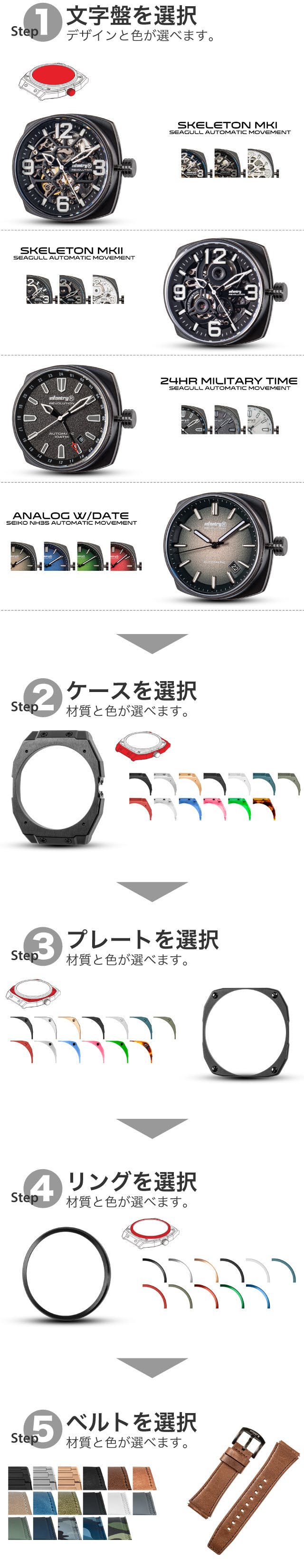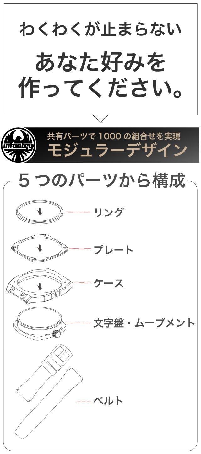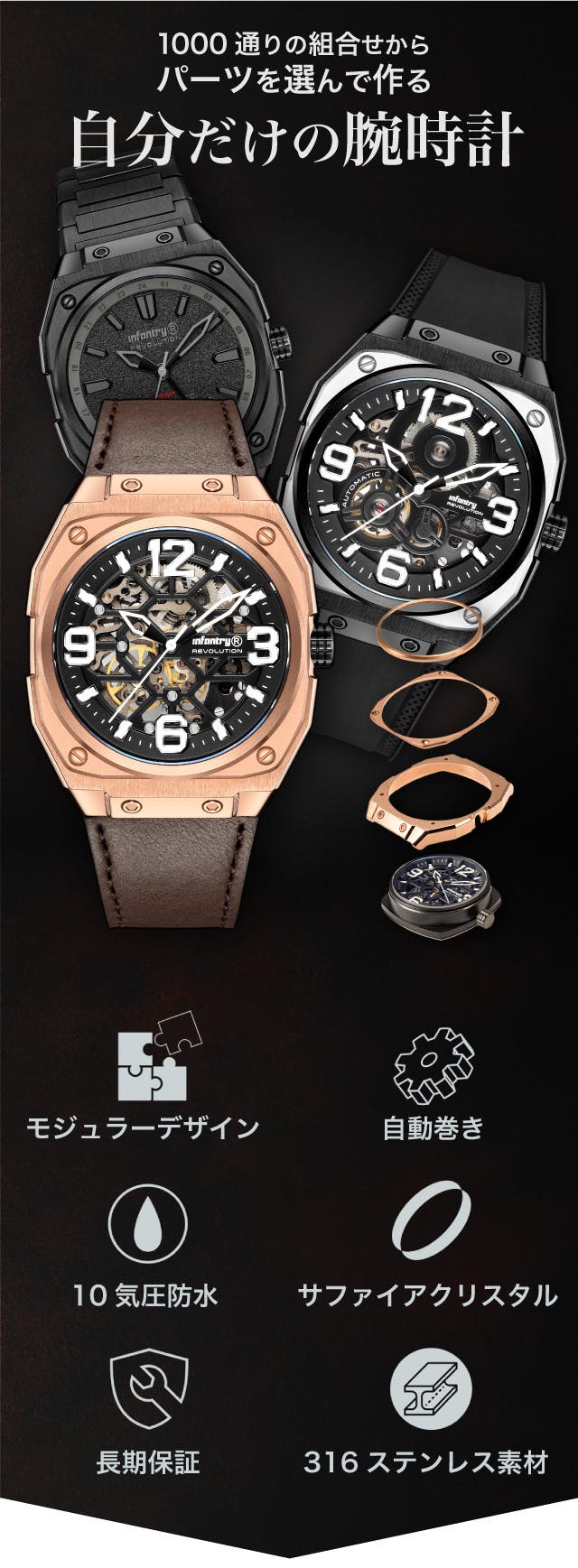 組み合わせるパーツの構造を共有化することで、見た目が違っても組合せられるようになっており、その組合せ数は1,000通りともなります。あなただけの腕時計をあなたのセンスで組合せて作り上げてください。