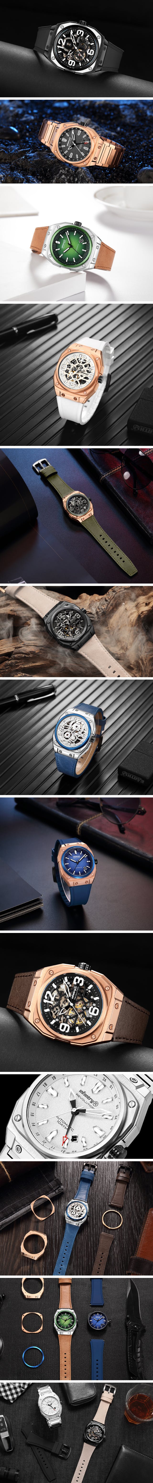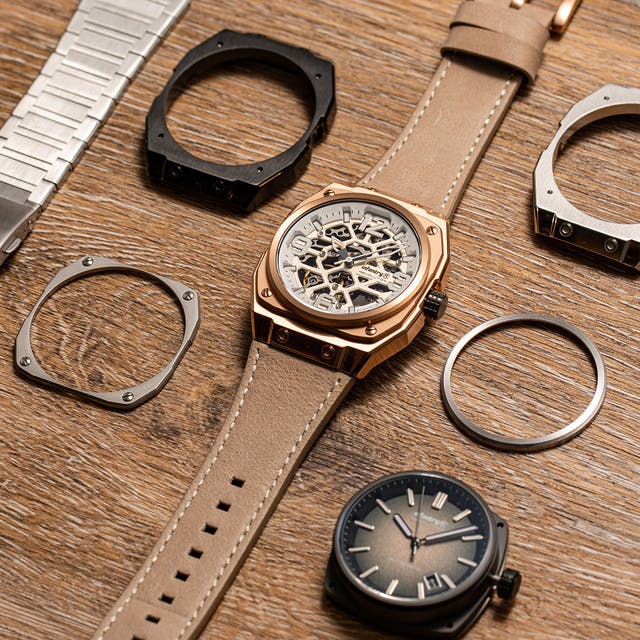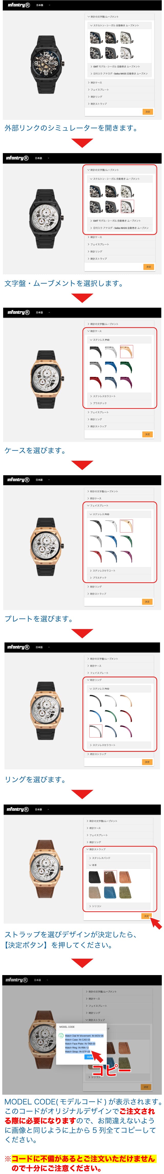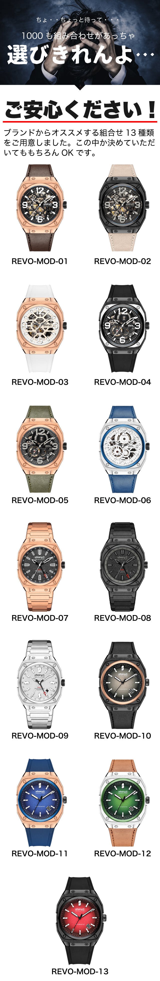 組み合わせるパーツの構造を共有化することで、見た目が違っても組合せられるようになっており、その組合せ数は1,000通りともなります。あなただけの腕時計をあなたのセンスで組合せて作り上げてください。