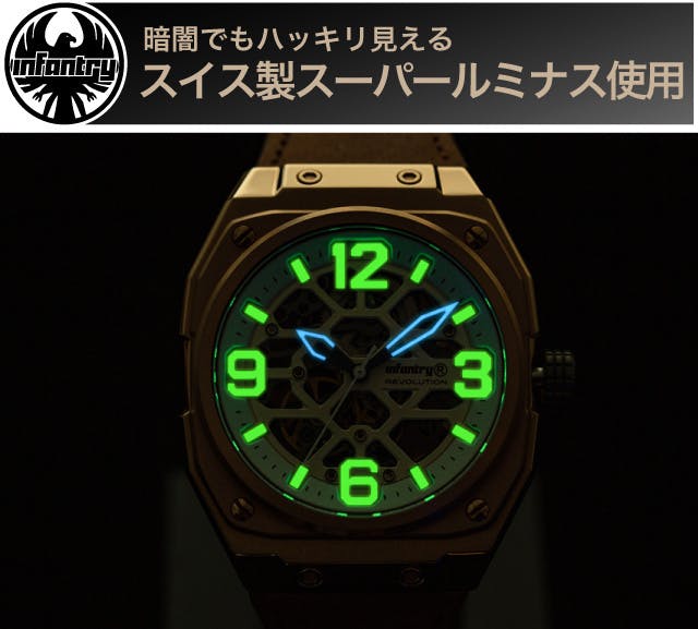 文字盤のインデックスと時計針はスイス製のスーパールミナスでコーティングされているため、暗闇の中でもはっきりと時刻を読み取ることができます。