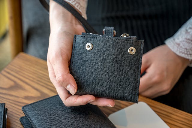 半財布の場合、手へすっぽり入るサイズを作りたくて数十回サンプルを見て、私達が思った手に収まる小さな財布を作り上げることができました。