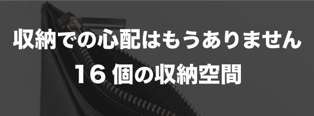 カードスロット6個、ポケット3個(ジッパーポケット含む)、半財布カードスロット4個、ポケット2個(切りポケット、ジッパーポケット含む)計16個の収納部分で構成されています。