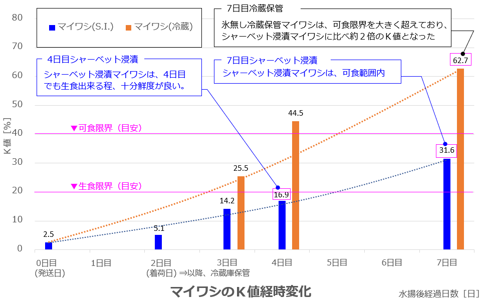 シャーベットアイスに浸した状態のイワシと氷水に入れた状態のイワシ、どちらも同じ冷蔵庫で保存したところ、シャーベットアイスのイワシは4日目でも生食でき7日目でも加熱すれば食べられたのに対して、氷水のイワシは3日目には生食ができない状態になり4日目には加熱しても食べられない状態になっていました。