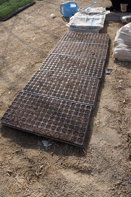3月下旬、種を蒔くための土を長し角の箱に入れる。