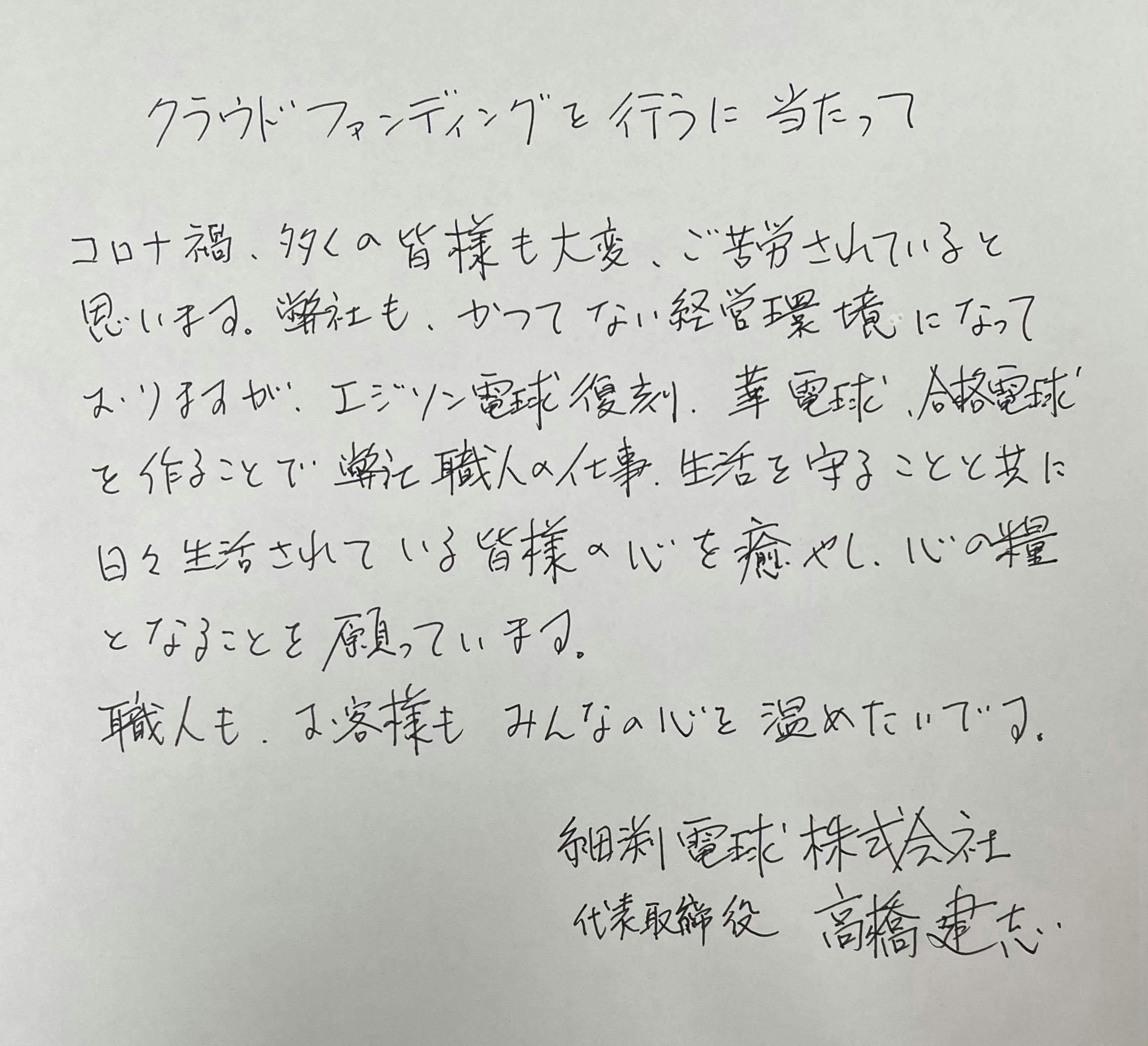細渕電球の運転資金や技術継承のために大切に使わせていただきます。