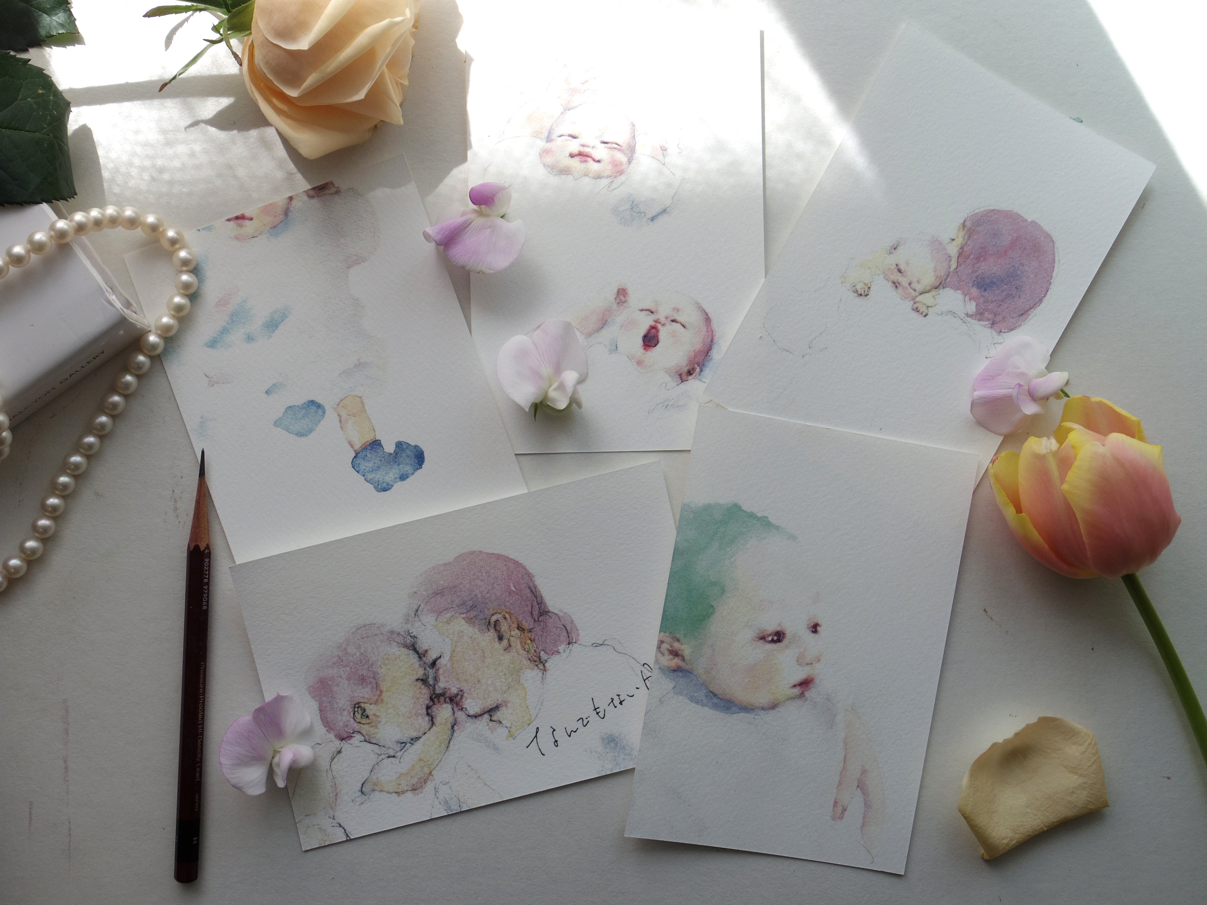 • こんにちは、yukkoです。心配なことも多いご時世ではありますが、皆さま体調などお変わりありませんでしょうか。早くも個展開催から2週間が経ちました。私は2週間経った今も、個展でいただいた美味しいお菓子を少しずついただきながら、ずっと幸せ気分を味わせてもらっています。個展を終えたときの感想などもnoteに綴りましたので、よかったらご覧ください。https://note.com/yukko_96/n/n4b29a5e90b78先日、クラウドファンディングの〈応援コース〉と〈ポストカードセットコース〉のリターンをお届けしました。ご支援いただいた皆さまに届きましたでしょうか。ご支援いただいた方一人ひとりを想像しながら、大切に送らせていただきました。もし、届いていないという方がいらっしゃいましたら、お手数ですがご連絡くださいませ。また、水彩画コースの皆さまにもお写真のやりとりに関するメールを送らせていただきました。ゆっくりお写真を選んだり考えたりしてくださいね、そういった時間もまた日々を振り返る貴重な時間になるかと思います。また、個展の展示作品をご紹介します。こちらは、〈君の瞳に映るもの〉という作品です。アップしてみると瞳の中に映る影が見えますでしょうか。まだハイハイも始まっていない息子の瞳に私の顔がうつっていたときのことを描いたものです。一心に見つめてくれたことが嬉しかったことを覚えています、いつかこの光景を描きたいとずっと思っていました。SNSにて、新しい作品の発表や最新情報を発信していますので、よろしければフォローいただけると嬉しいです。