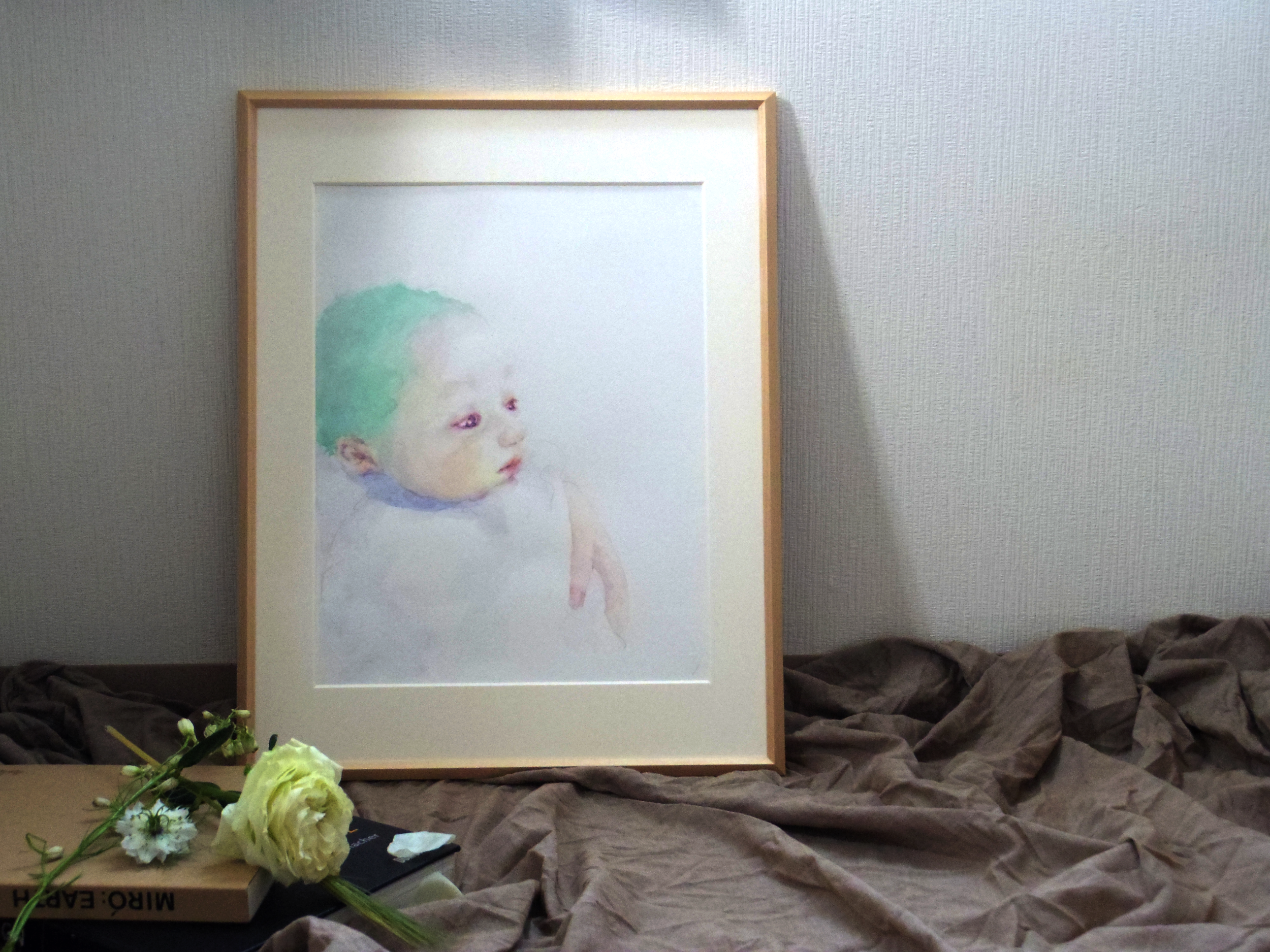 本個展を彩った、とっておきの作品をお届けします。直に目で見て楽しんでいただける大きめサイズの水彩画です。額装は、作品の世界により没入できるよう、肌の色が優しく映る木地の額と乳白色のマットを選びました。個展終了後にオススメの作品をご提案いたします。(ご提案作品以外のものを選ぶことも可能です、ご相談ください。)