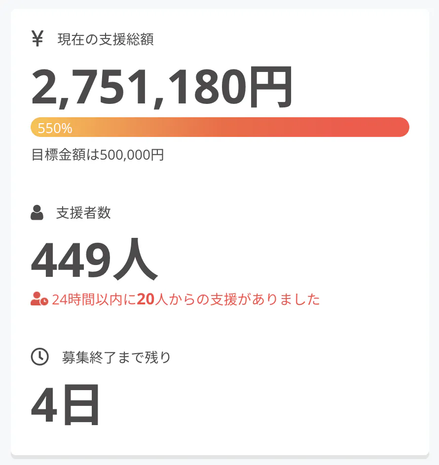 本プロジェクトのスタートして約1ヶ月、ご支援いただいた方の数は440名を超えました。支援金額も275万円を突破し、なんと目標金額の550%を達成することができました!