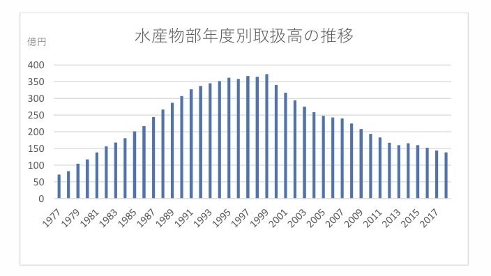 水産棟は柏市場の中でもトップクラスの売上高を誇るのですがそれでも1999年をピークに20年余りで半減しています。