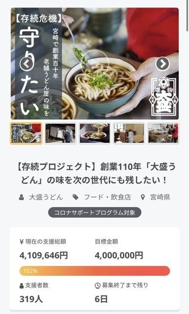 こんにちは、大盛うどんです!募集終了まで残り3日となりました!先日皆様のおかげで目標金額である¥4,000,000を達成し、現在はNext Goalである¥4,500,000に向けて募集しております!ご支援いただいたお金は、容器代や材料代など商品を1円でも安く皆様にお届けするために使わせていただきます。現在Next Goalまで約¥100,000となっております。どうか最後まで皆様と一緒に大盛うどんを応援し、この目標を達成したいと考えております。ラストスパート、拡散など皆様にご協力いただけると幸いです。是非ともよろしくお願い致します!