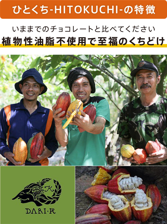 「ひとくち -HITOKUCHI-」では、フェアトレードから一歩進み、インドネシアでカカオ栽培・発酵指導などを通じ、カカオ農家と協業して商品価値向上と収入向上の両立に取り組む、Dari K社の高級チョコレート原料をメインで使用しています。