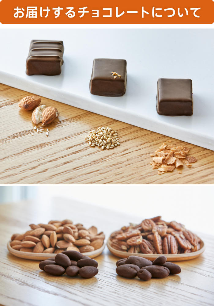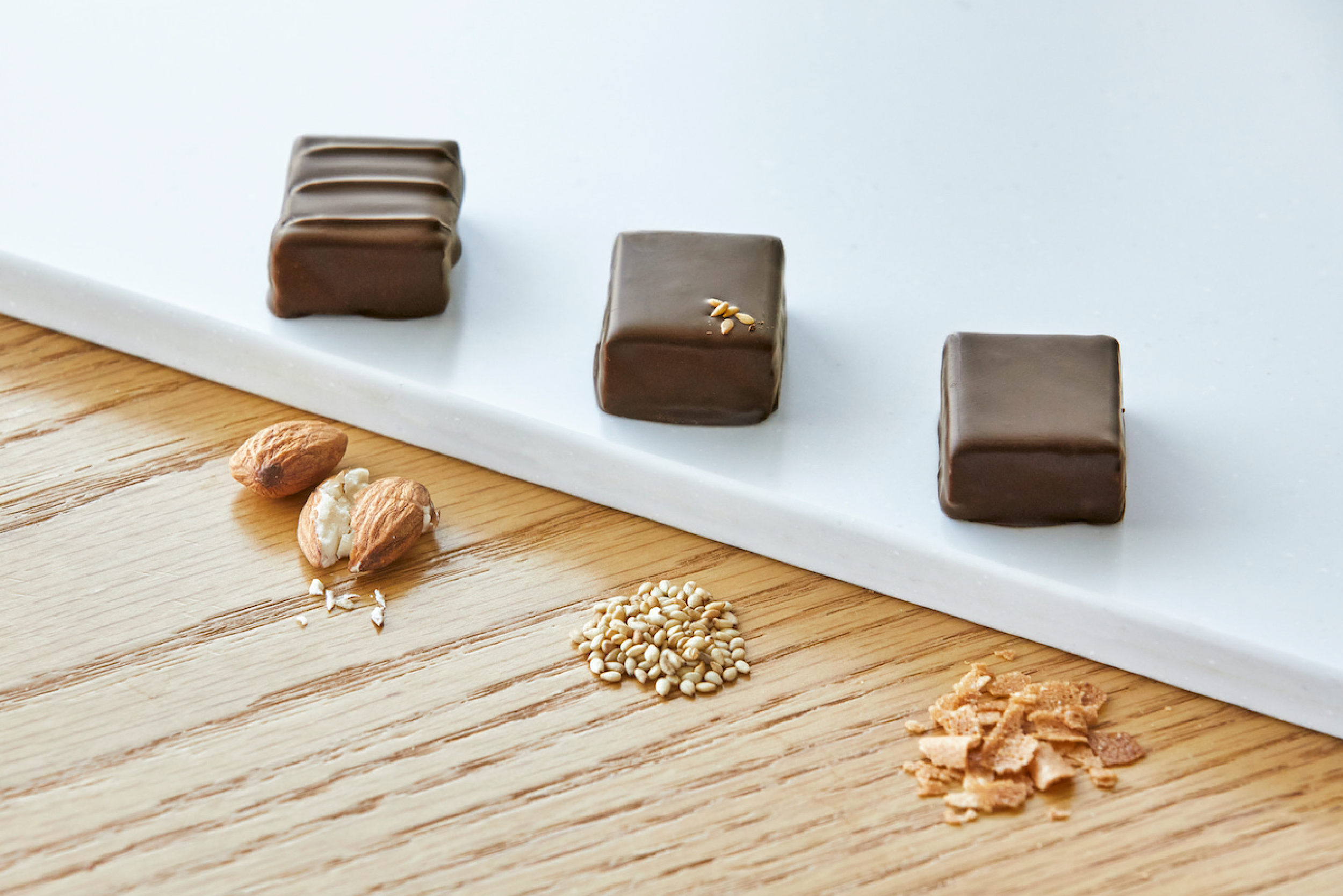 職人が温度を0.1度単位で調整することで、ベストなくちどけ感を作り上げました。チョコレートに合わせる素材を活かした、ひとつひとつ異なる食感で、また食べたくなる印象的な味わいです。
