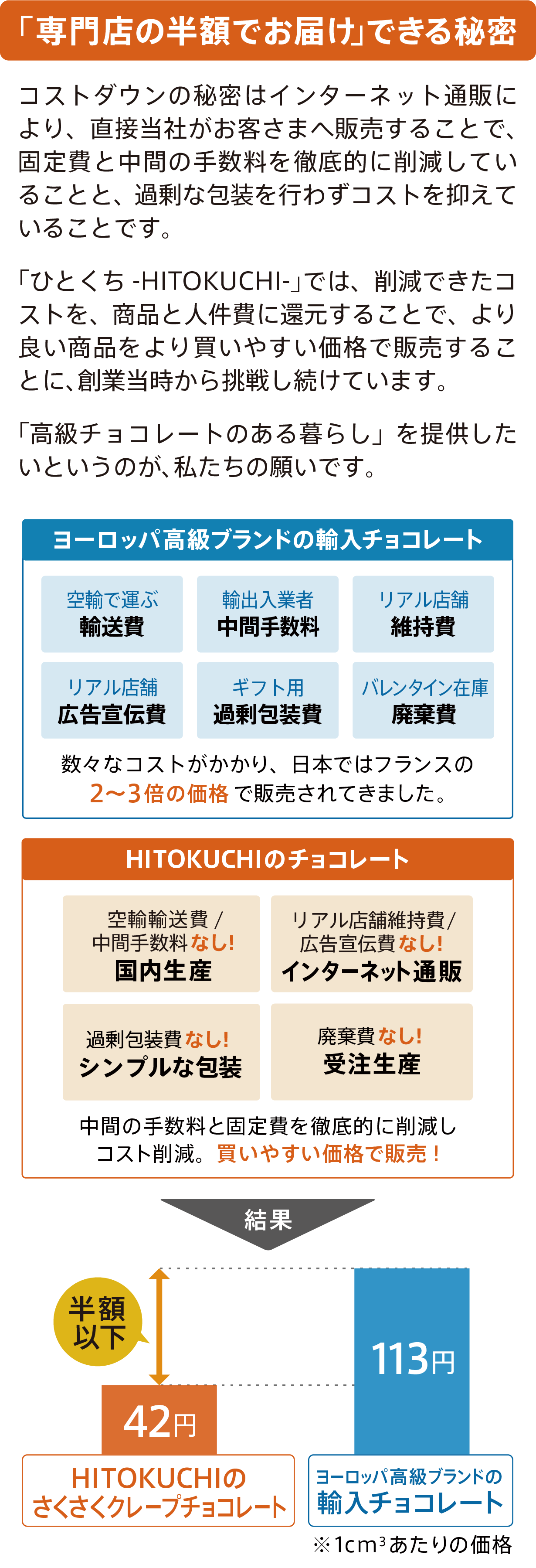 「国内生産・インターネット直販・無店舗」という、材料費・人件費以外のコストを最大限カットしたビジネスモデルで、"ヨーロッパ高級ブランド品質のチョコレートを、専門店の半額でお届け"することに挑戦し続けています。