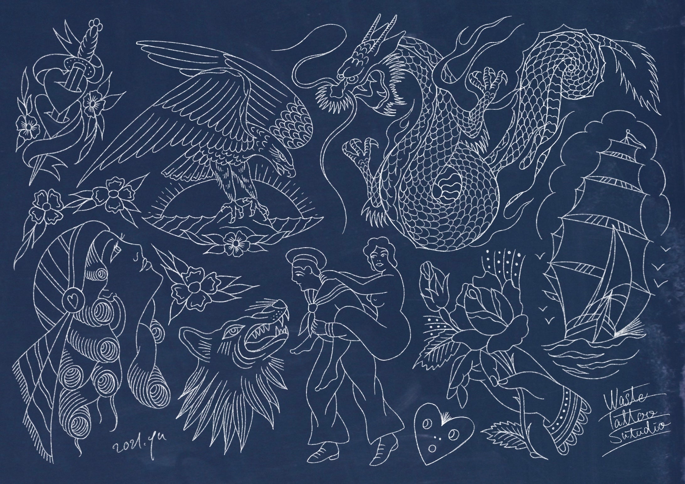 ※施術するモチーフは、お客様とご相談のうえ決めていきますが、基本的にはアメリカントラディショナルに限ります。