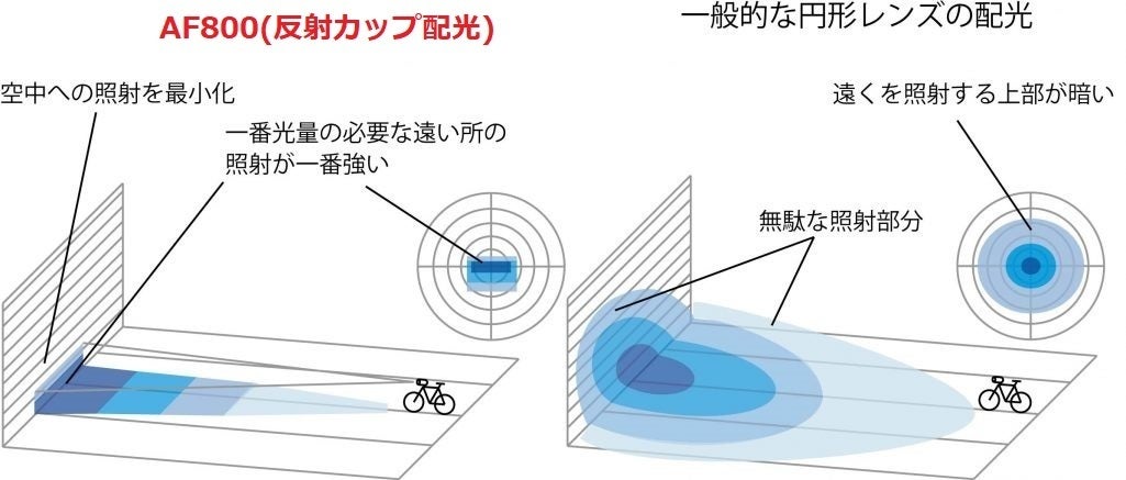 カットオフ技術により対向車、人に眩しくなく、双方の安全性がこれまでの自転車ライトよりも大きく改善されます。