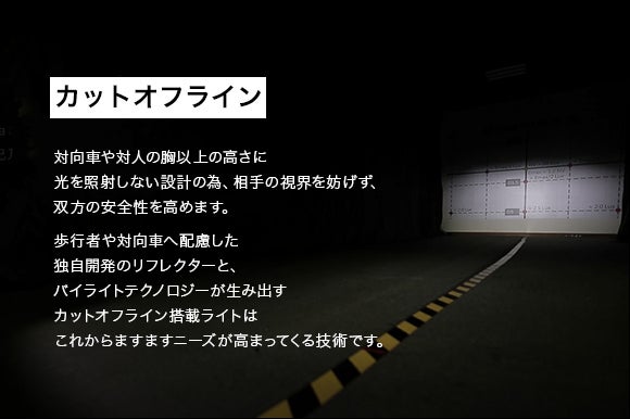 対向車や対人の胸以上の位置に光を照らさない設計の為、対向車・対人ともに眩さがなく、双方の安全性が高くなります