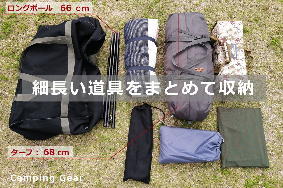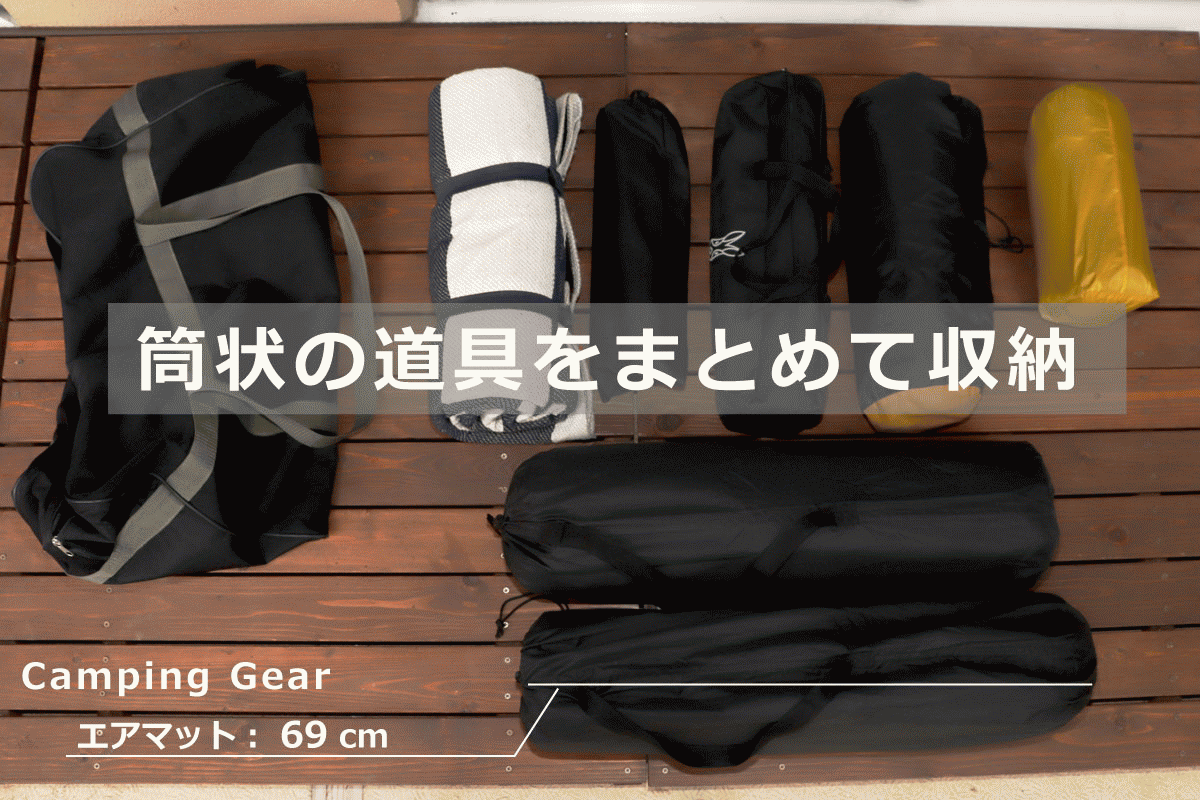 寝袋やマットなど、軽量で筒状の道具をまとめて管理、持ち運べます。