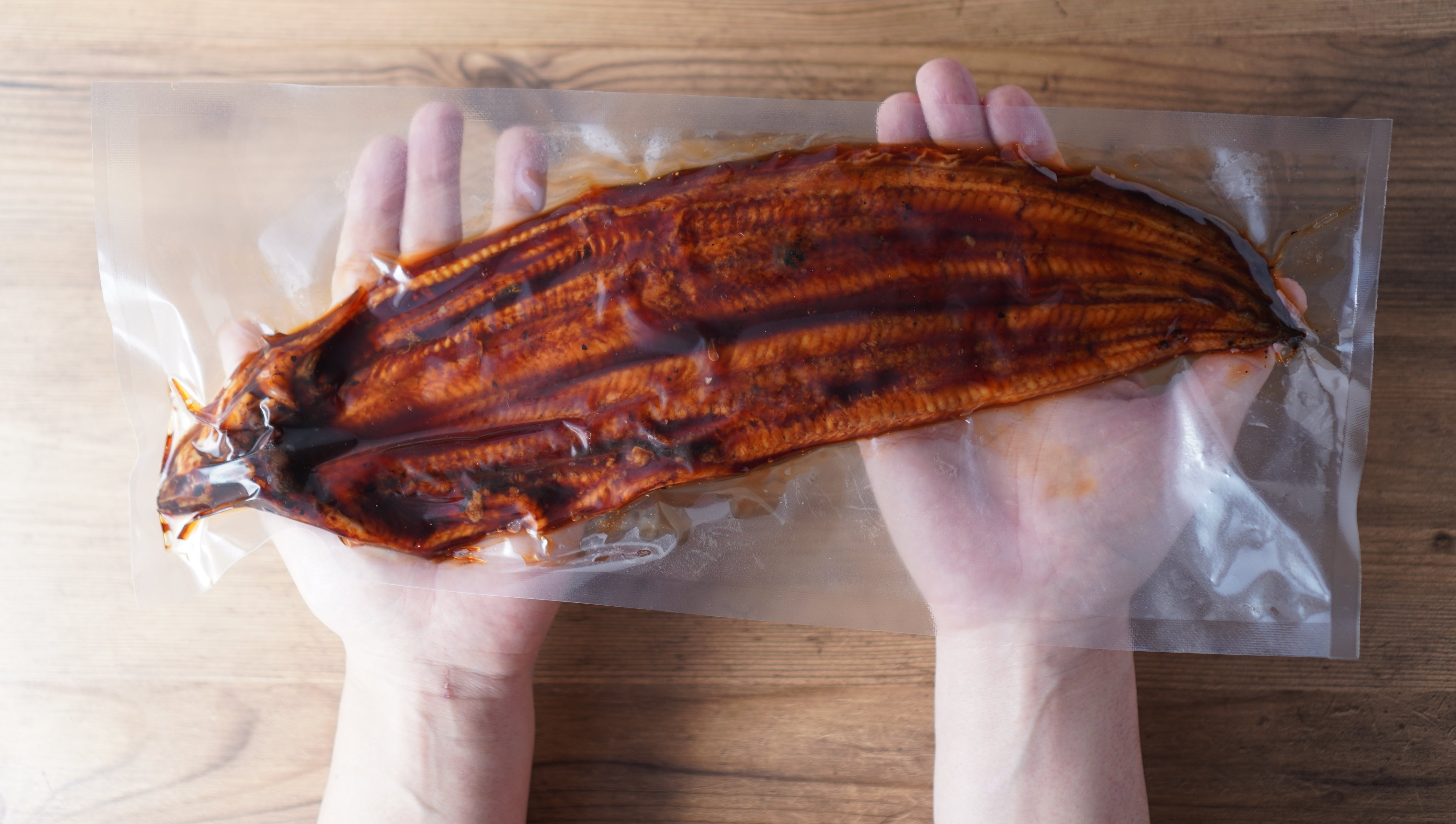 うなぎは丁寧に炭火で焼いた後、タレに浸けて真空パックにしています。それを冷凍保存し、お手元までお送りしますので、温めるだけですぐにお召し上がりいただけます。