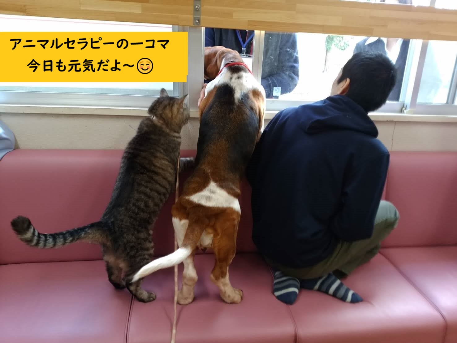 セラピーキャットのるーちゃん(琉太郎、雄の白キジ3歳)は、3年前の夏に両手脚をゴムで縛られて遺棄されました。結果、3本の手脚を失いました。それでも、アニマルセラピーでは、快活なるーちゃんの姿から大きな勇気と元気を利用者さん達は貰っています。