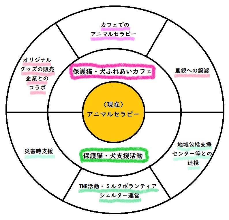 また、カフェやシェルターを介して地域の仲間や行政機関と繋がり、更にオリジナルグッズ販売等を通して企業と連携することでメリットが生まれ、幸せの輪が拡がると考えています。