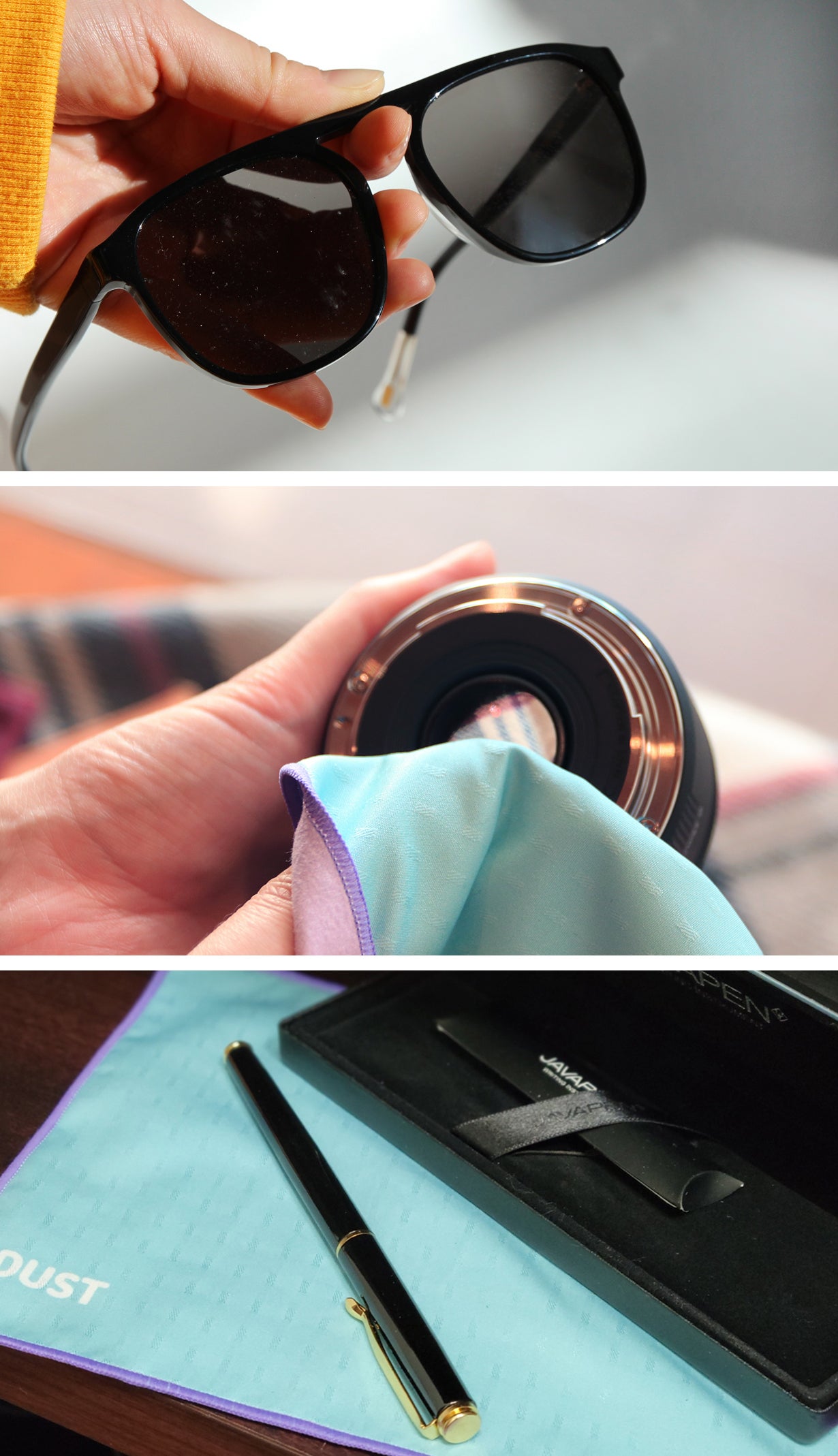もう異素材で拭いてレンズや時計を傷めたり、油分が取れず伸ばして余計汚くなってしまったり…というクリーナーのちょっとしたいら立ちをこれ一枚で全て解決します。