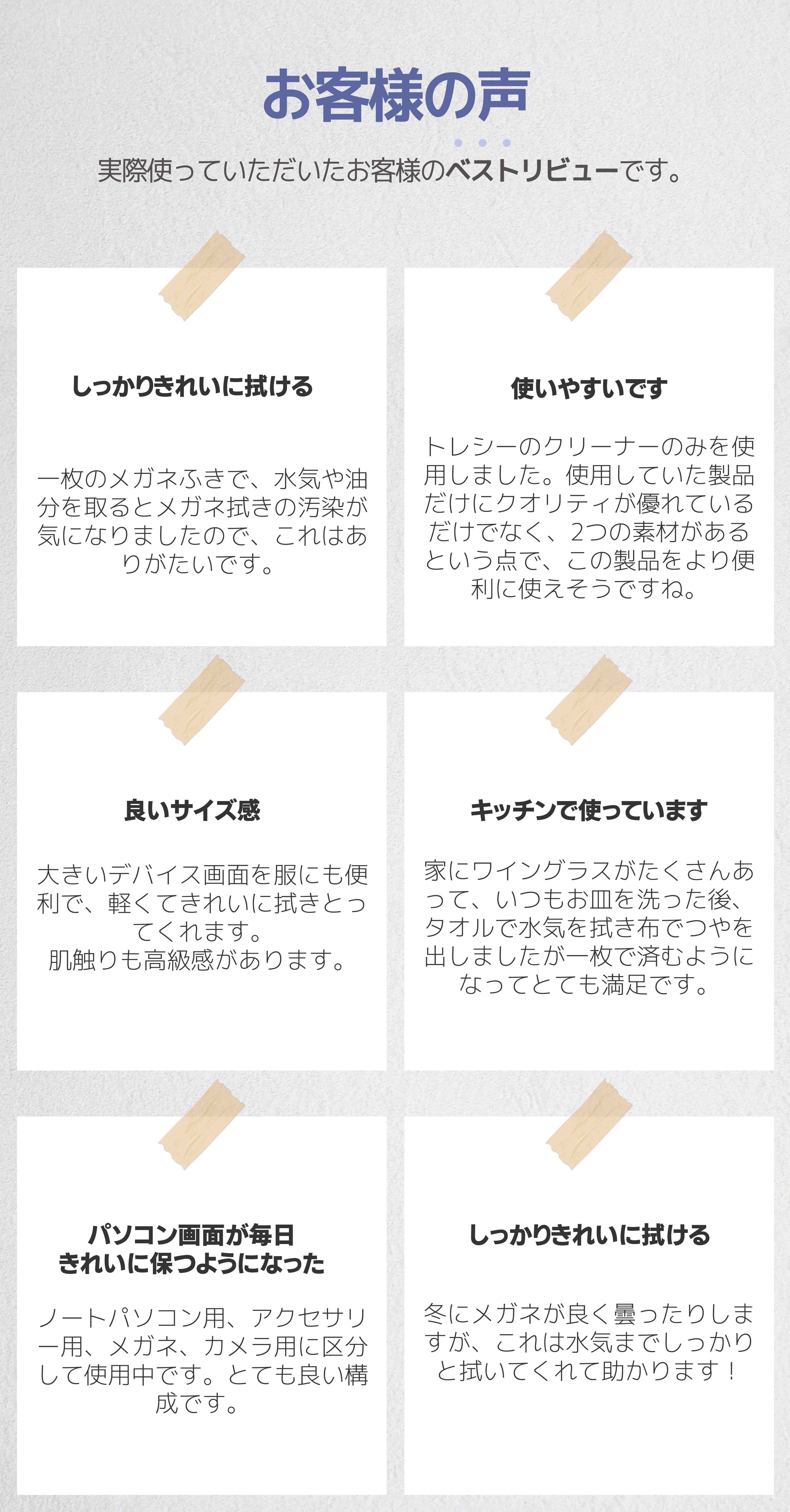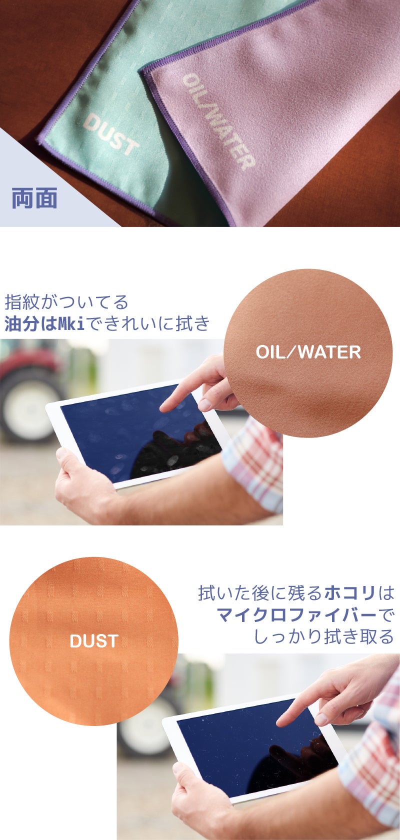 水やほこりはもちろん、油分、指紋、皮脂からメガネ、スマホ、時計やPC、グラスや楽器のケアは1枚2役でクリーンにしかも手洗いできて繰り返し使える今までになかった優れモノです。