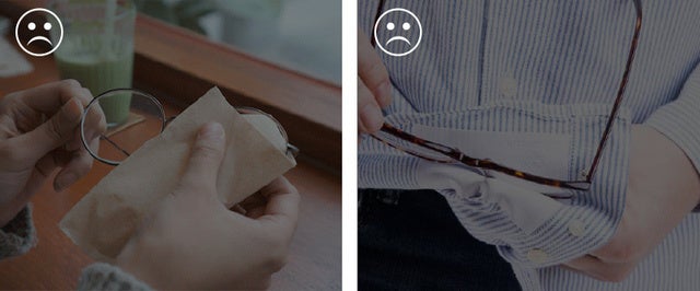 乾いたティッシュやハンカチ、またはシャツの袖口でゴシゴシ乾拭きをしてしまうと、メガネにキズがついてしまいます。