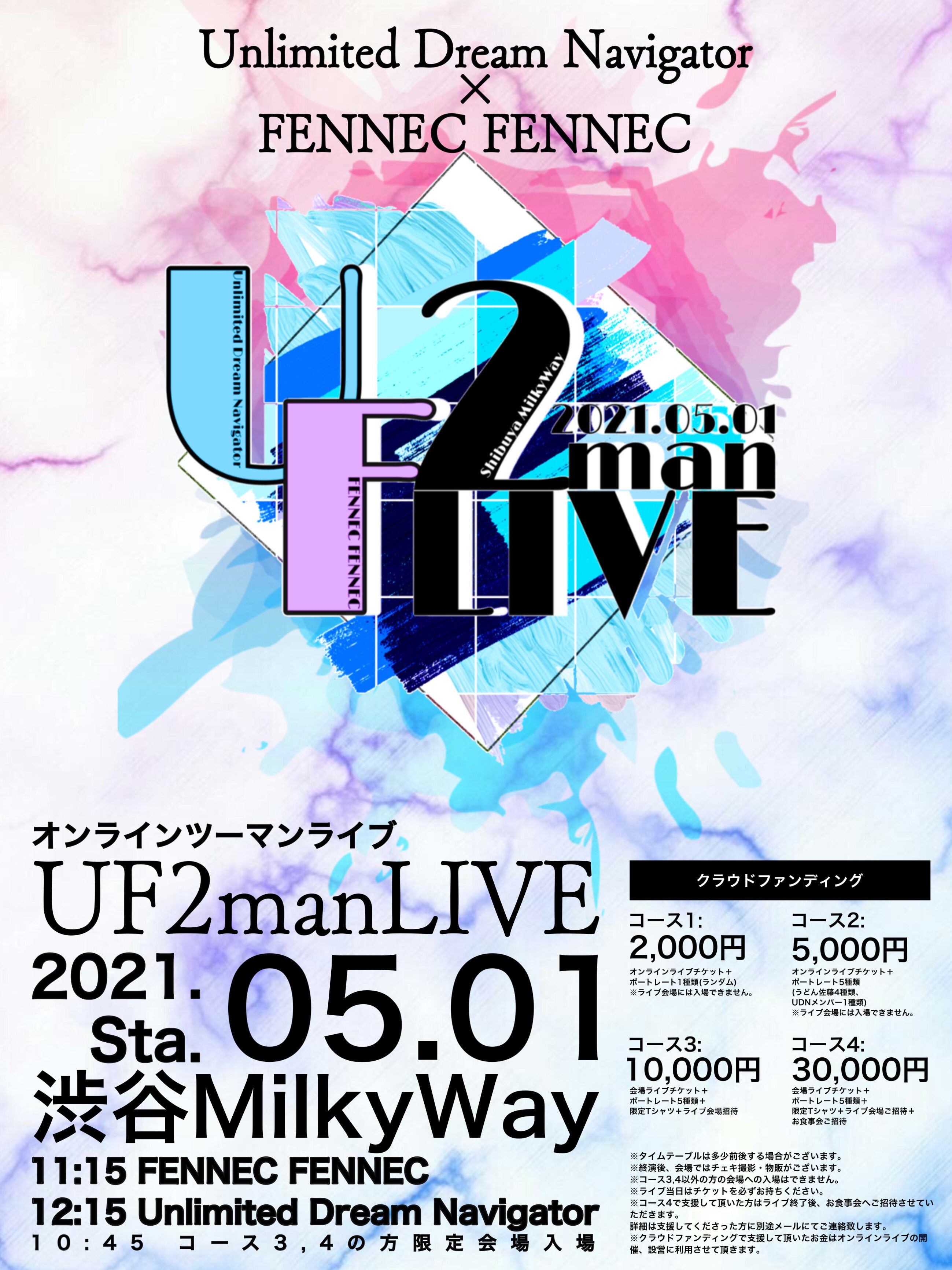 5/1(土)渋谷MilkyWayにて、Unlimited Dream NavigatorとFENNEC FENNEC のオンラインツーマンライブを行います☆ コースによってはポートレートや限定Tシャツがついたり、ライブ会場やお食事会に招待♪ 何口でもご購入可能です! 一緒にライブを楽しみましょう☆
