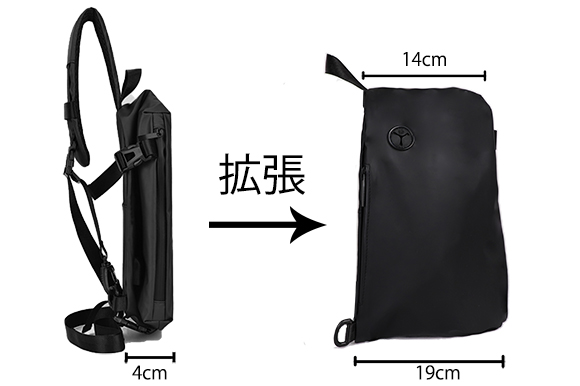 左右はポケットの入り口になっていて、最薄時で厚さは約4cm、最大拡張時は15cmとなります。