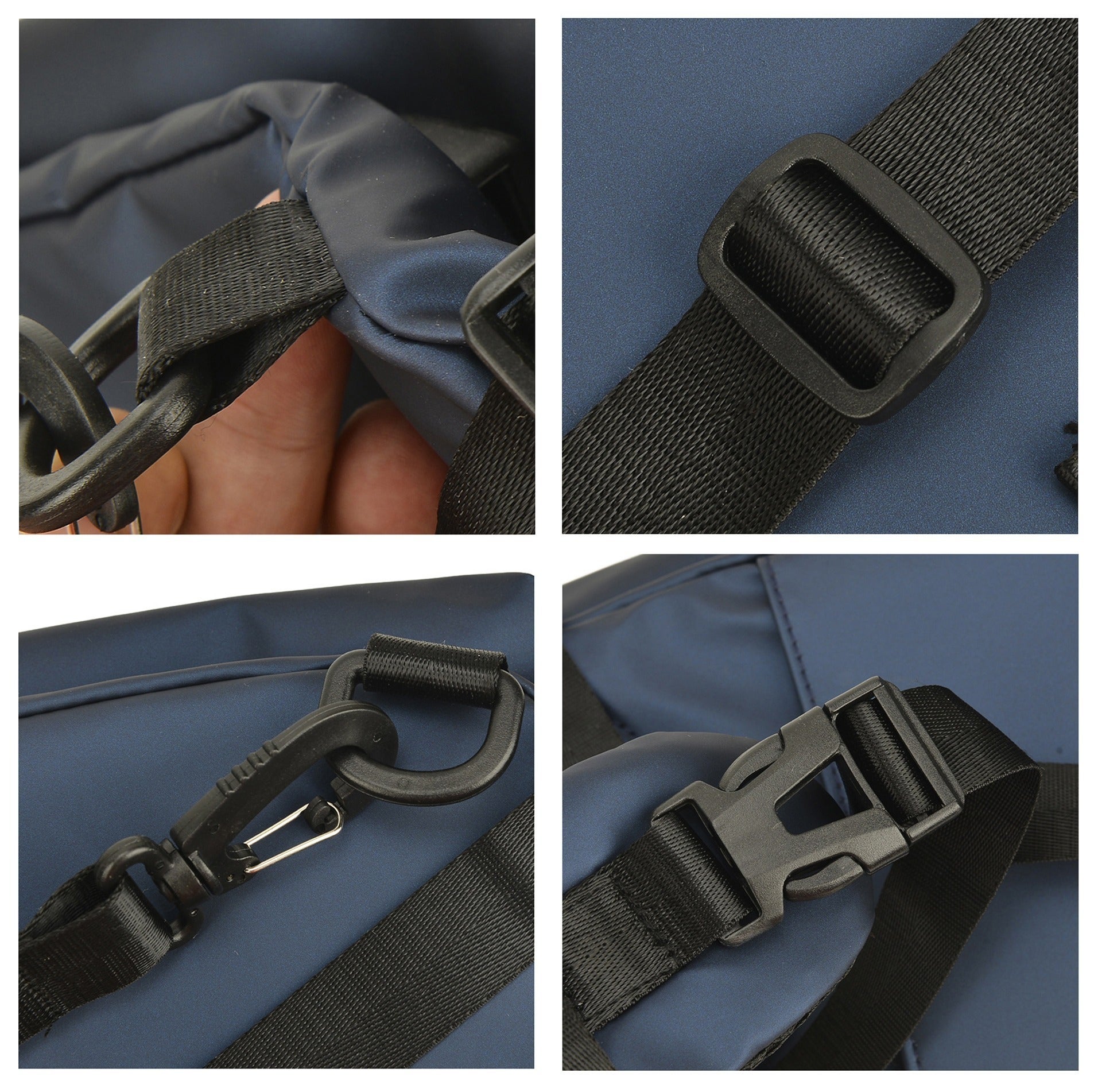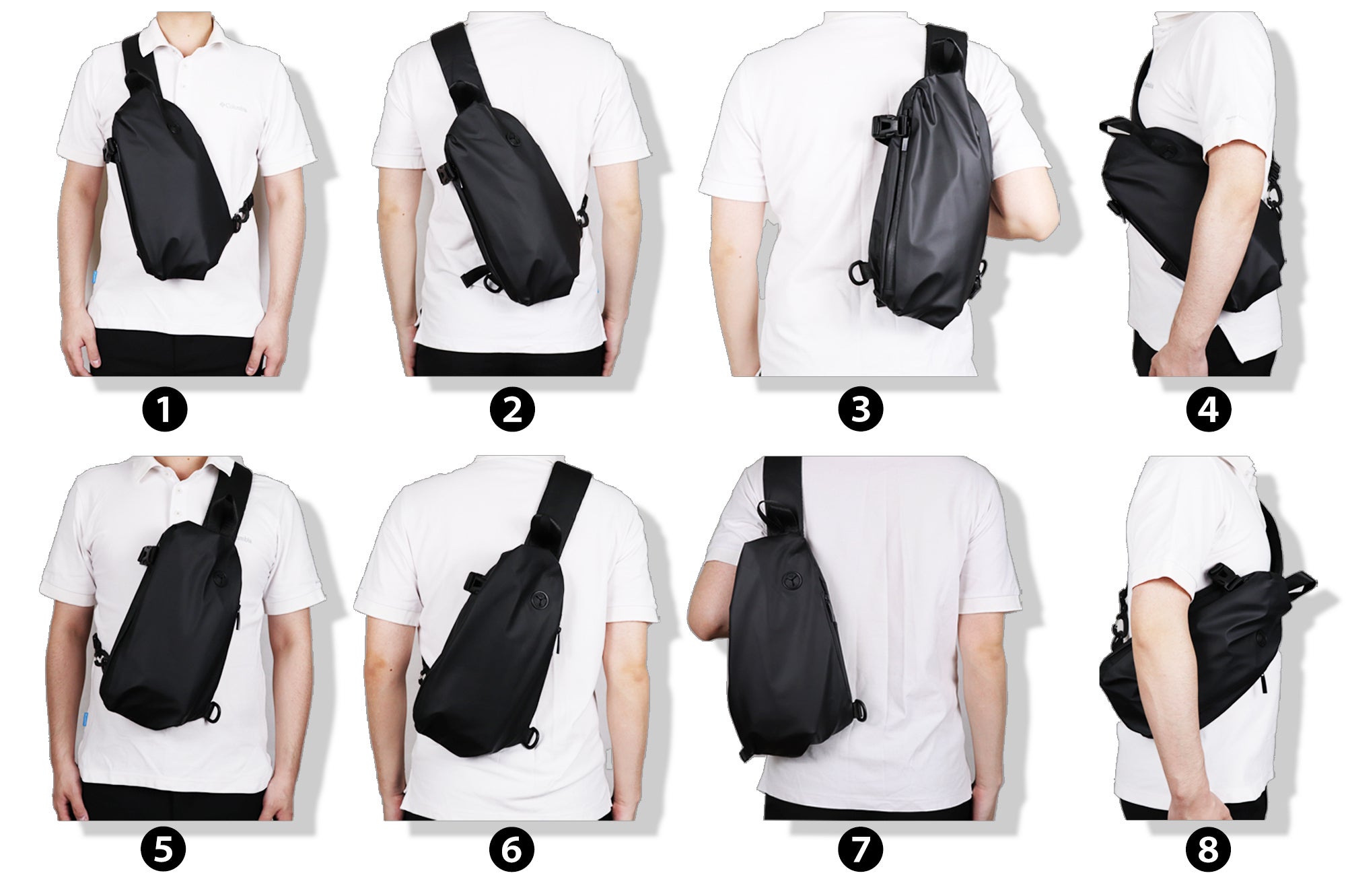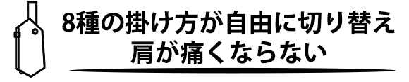 掛け方は8種類。ベルトの長さも調整可能です。いつでも体にフィットする形で、肩の負担を軽減します。