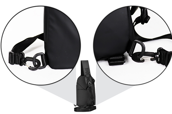 バッグの左右に留め具がついているので、ベルトのフックを左右に掛け替え可能。