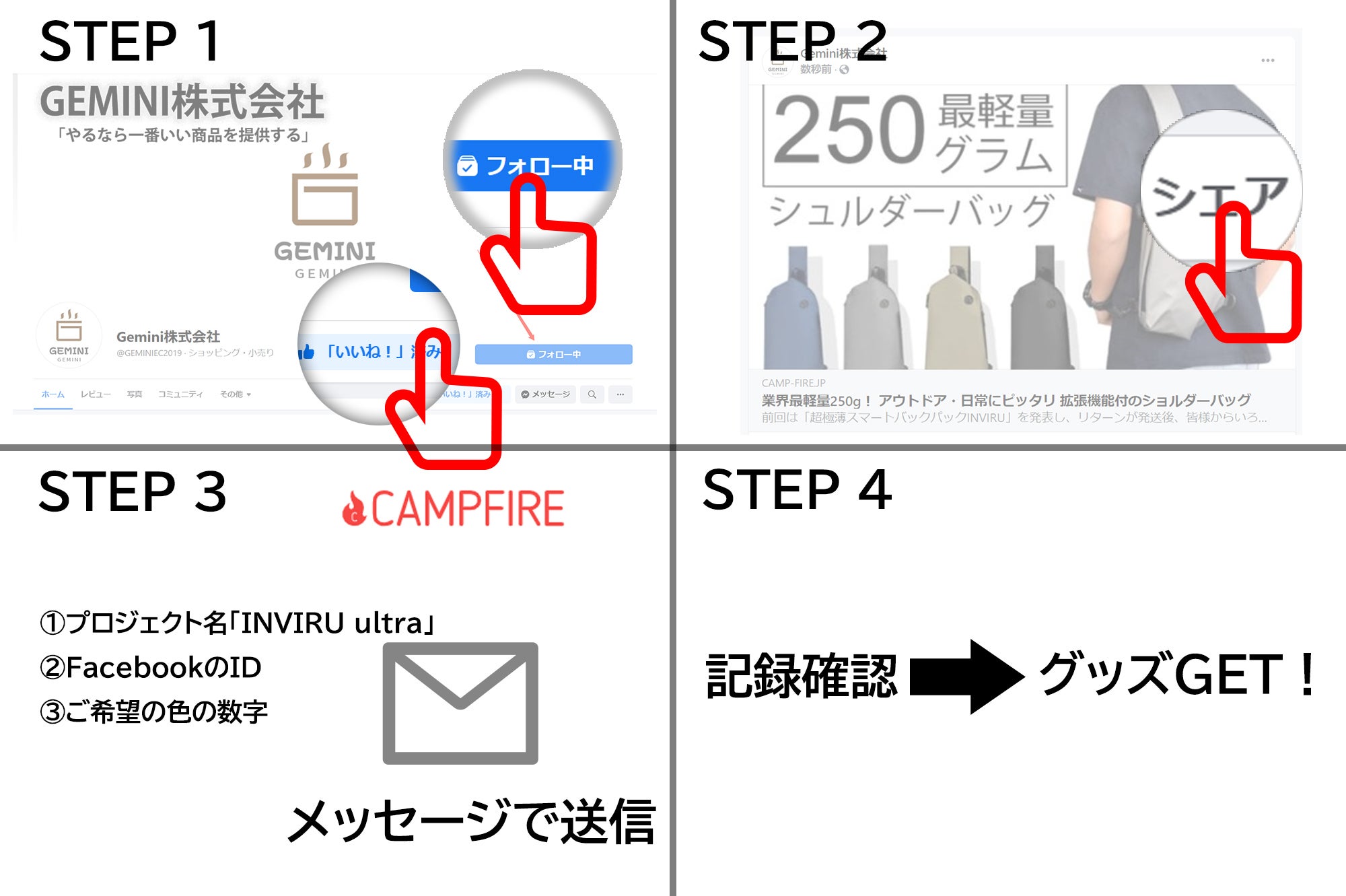 Facebookの公式ページ「https://www.facebook.com/GEMINIEC2019」に入り、ホームページの「フォロー」と「いいね!」をクリックし、プロジェクト「INVIRU ultra 」を見つけ、ボタン「シェア」 を押せば完了。最後にCAMPFIREからメッセージ機能でプロジェクト名「INVIRU ultra 」、FacebookのID(ユーザー名)とご希望の色の数字を送っていただき、こちらが記録を確認した後、無料で15色のホルダーから1個をご獲得いただけます。