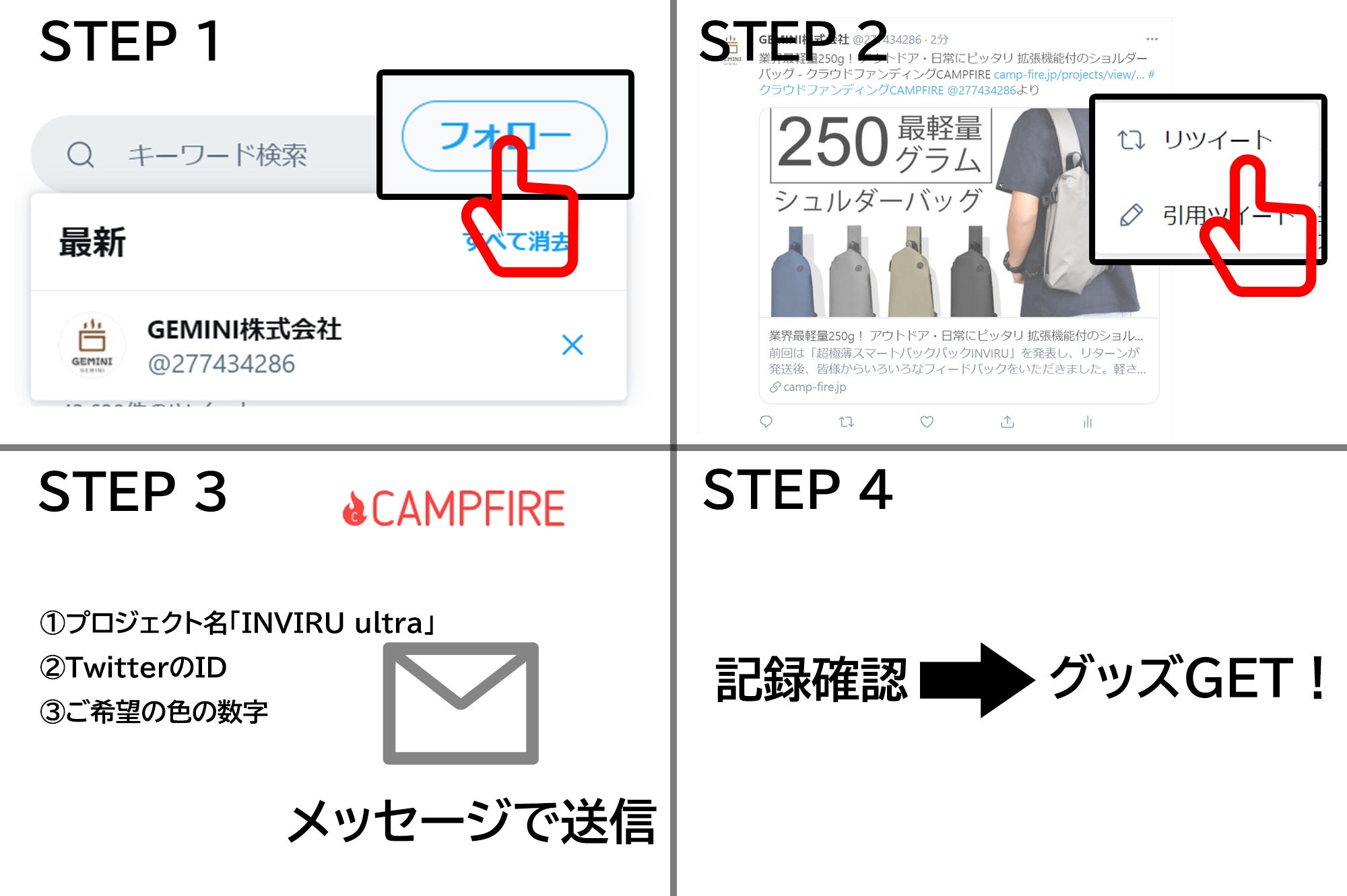 Twitterの公式アカウント「GEMINI株式会社」をフォローし、プロジェクト「INVIRU ultra 」のツイート見つけ、ボタン「リツイート」あるいは「引用ツイート」を押せば完了。 最後にCAMPFIREからメッセージ機能でプロジェクト名「INVIRU ultra 」、TwitterのID(ユーザー名)とご希望の色の数字を送っていただき、こちらが記録を確認した後、無料で15色のホルダーから1個をご獲得いただけます。