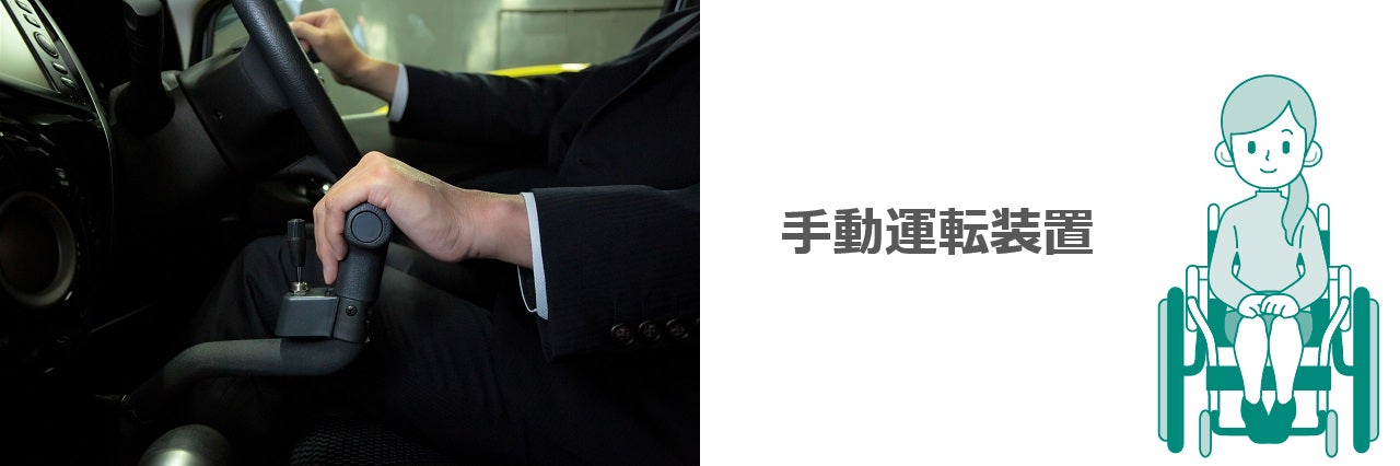 車いすの方が、手だけで運転できる装置です。手動運転装置はミクニライフ&オート(旧:ニッシン自動車工業)のAPドライブを採用。レバーを引くとアクセル、押すとブレーキ操作が行えます。ウィンカースイッチ、ホーンスイッチ、ブレーキロックスイッチの操作機能をグリップに配置しています。