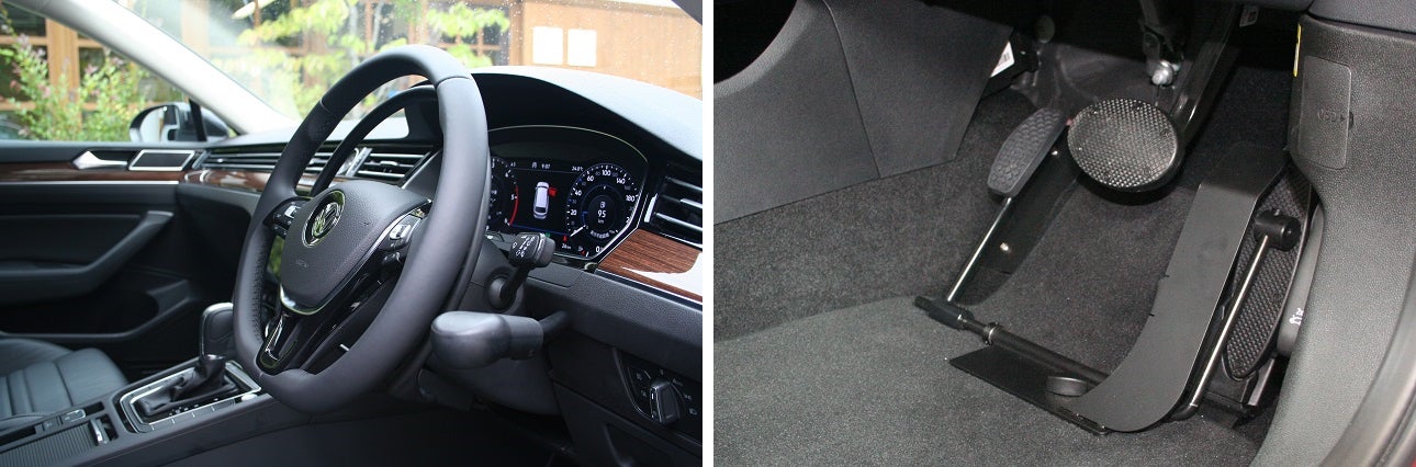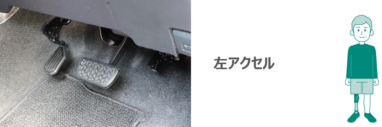 右足が不自由な方が、左足でアクセル操作ができる装置です。左アクセルはミクニライフ&オート(旧:ニッシン自動車工業)の吊下着脱式 左アクセルを採用。アクセルペダルを着脱可能にし、ペダルの付け替えで左右の切り替えが行えます。義足をご使用の方や関節を曲げにくい方に最適です。