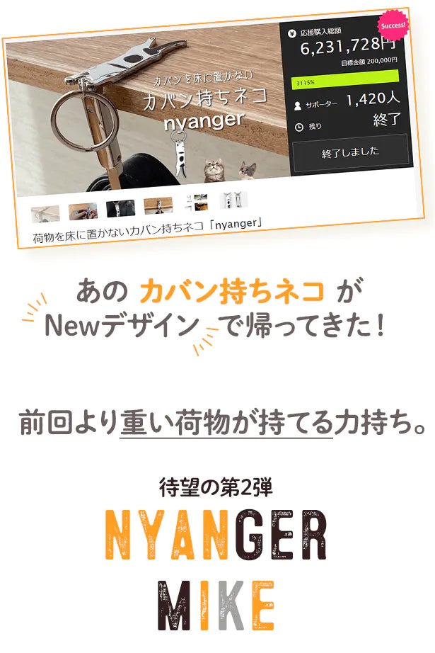 2024/07/31 09:29みなさん、こんにちは^^nyagnger プロジェクトが残り16時間を切りました!おかげさまで、目標値は大幅に達成することができました!改めて、ご支援いただいたみなさま、誠にありがとうございます。数に限りはございますが、お得にゲットできる最後のチャンスとなります!https://camp-fire.jp/mypage/projects「ご友人やご家族へのプレゼント」としてもご購入頂いたとのお声も多く頂いております。プレゼントに最適なオリジナルBOXもご用意しておりますので、ぜひ猫好きな方への贈り物としてもご検討ください^^https://camp-fire.jp/mypage/projectsまた、ライフスタイルを豊かにするためのアイテムを紹介している【lifehacker】というメディアにもnyangerの紹介記事が掲載されています!https://www.lifehacker.jp/article/236004-machi-ya-nyanger-review/ぜひご覧くださいませ。では、残り13日にはなりますが、引き続きよろしくお願いいたします!ーーーーーーーーーーーーーーーーーーーーーーーーーーーーーーーーーーーーーーーー【nyanger PR動画】https://www.youtube.com/watch?v=YXcOM-co12Q【instagram「nyanger_」】https://www.instagram.com/nyanger_/ーーーーーーーーーーーーーーーーーーーーーーーーーーーーーーーーーーーーーーー もっと見る