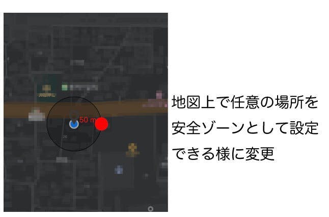 そこで、GPSの位置情報を指定しその半径50m-100mを任意で安全ゾーンに登録できる様に変更いたしました。