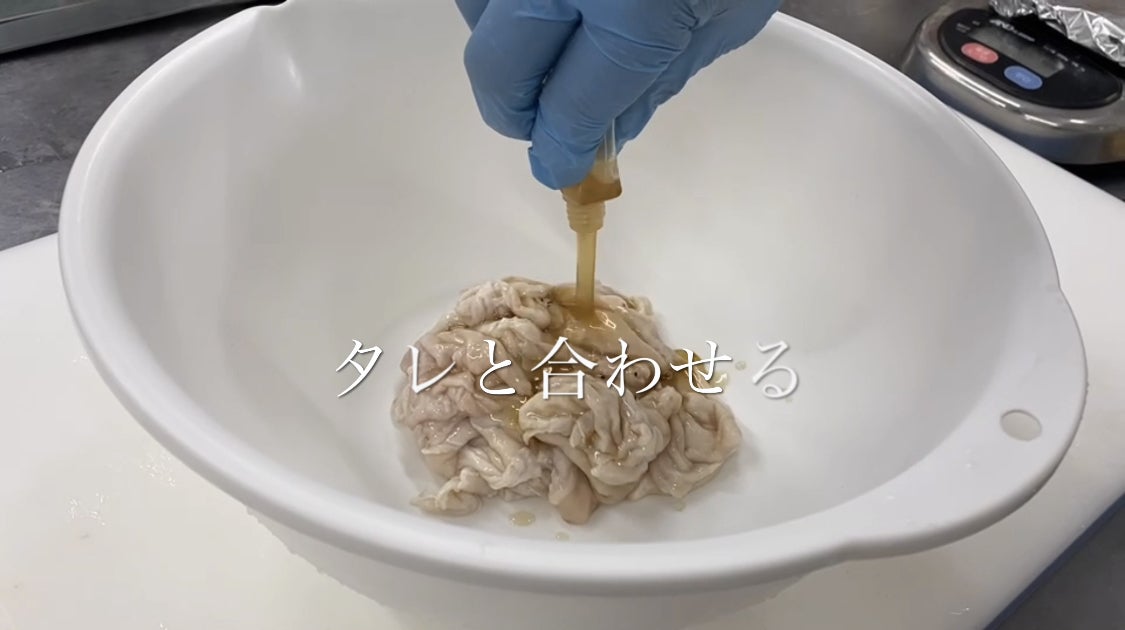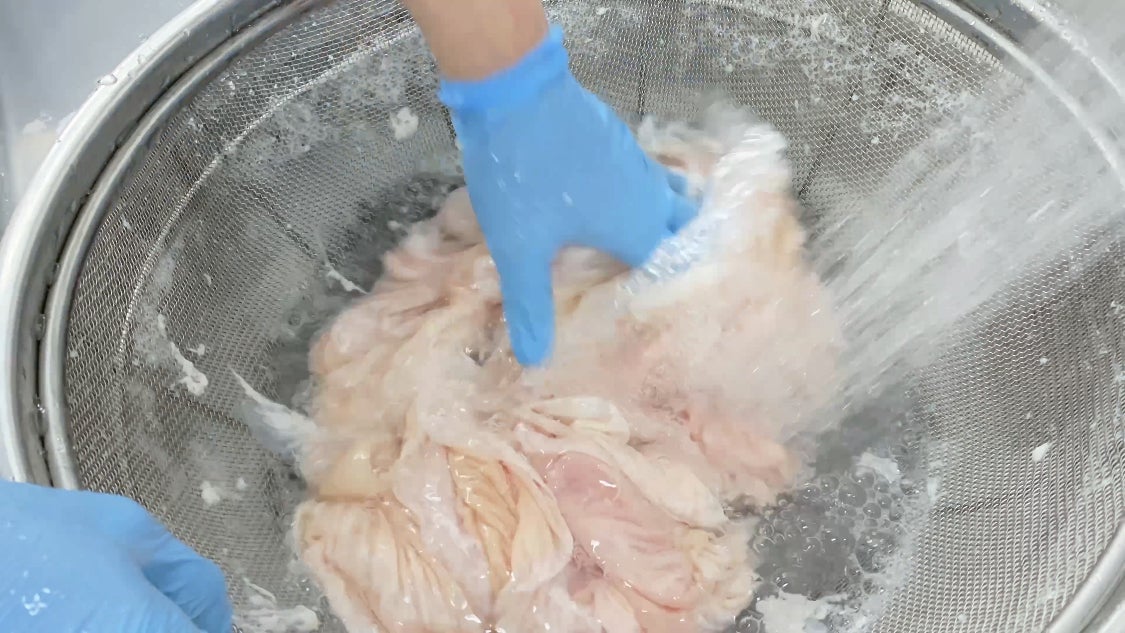 スーパーなどにある豚ホルモンは安価な海外産の豚ホルモンを味付けをして販売。ご家庭で食べる時にフライパンで焼いた時に『臭み』『食感』『旨味』に限界があると考えていました。私達がこだわっている『北海道産朝取り生豚ホルモン』ですら、フライパンで焼くと旨味とは別に多少臭みが出てしまう事に違和感がありました。そこで、研究プロジェクトがスタートしたのが1年前。Youが冷水で洗う『北海道産朝取り生豚ホルモン』は、そのまま良質な状態で加工、ご提供できる方法はないか