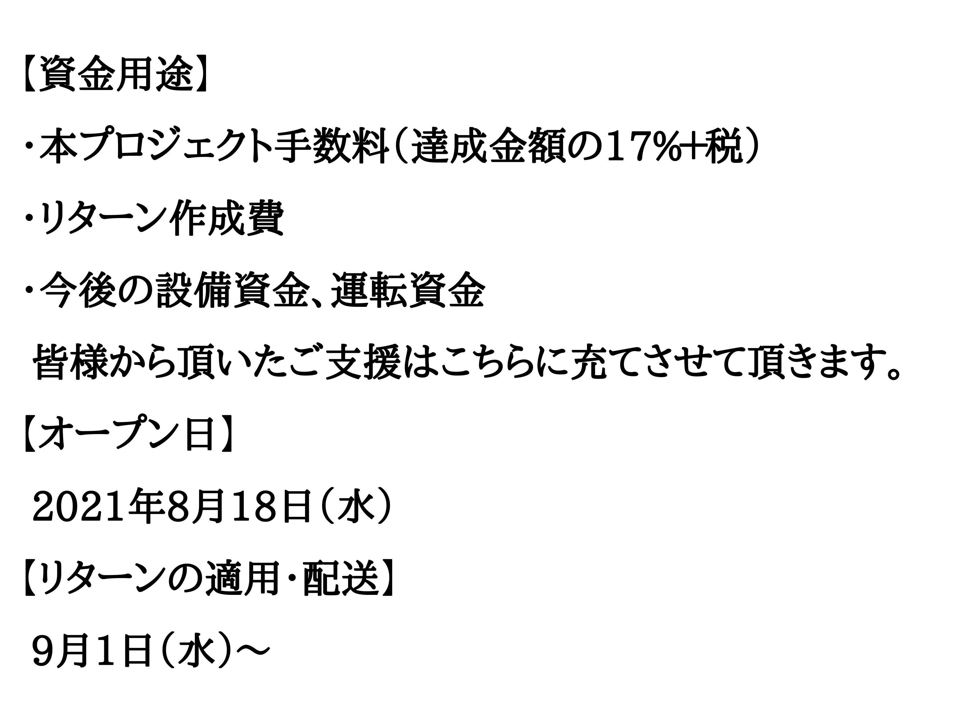 ●対価以外に必要な費用:プロジェクトページ、リターンに記載のとおり。