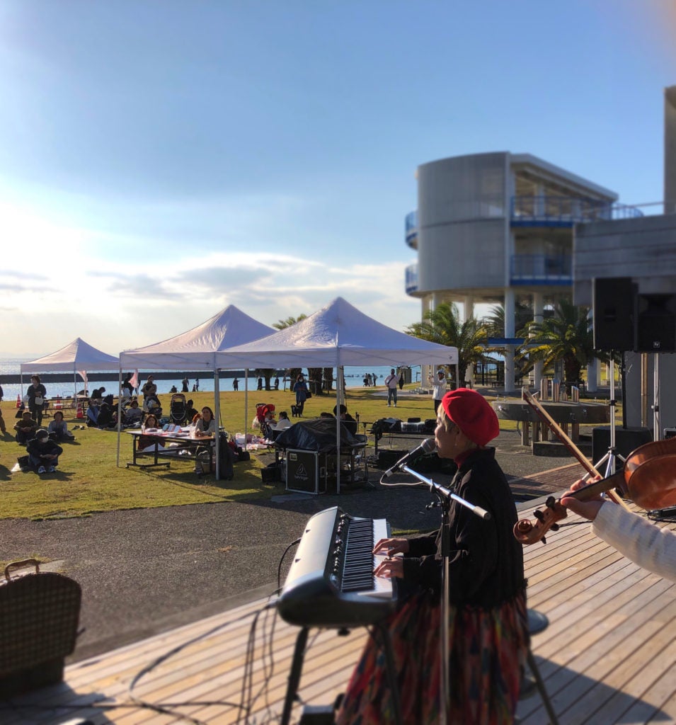 しかし一方で、本業であるミュージシャンとしての活動の芯はやはり「お客さんを前にした演奏がしたい!」とずっと痛感し続けているのも事実。そこで、去年の11月には仲間のミュージシャンを集めて、海辺の広場で小さなフェスを入場無料で開催しました。寒くなり始める季節で、しかもコロナ騒ぎの中、200人ほどのお客さんが来て下さり、投げ銭もたくさんいただくことができました。