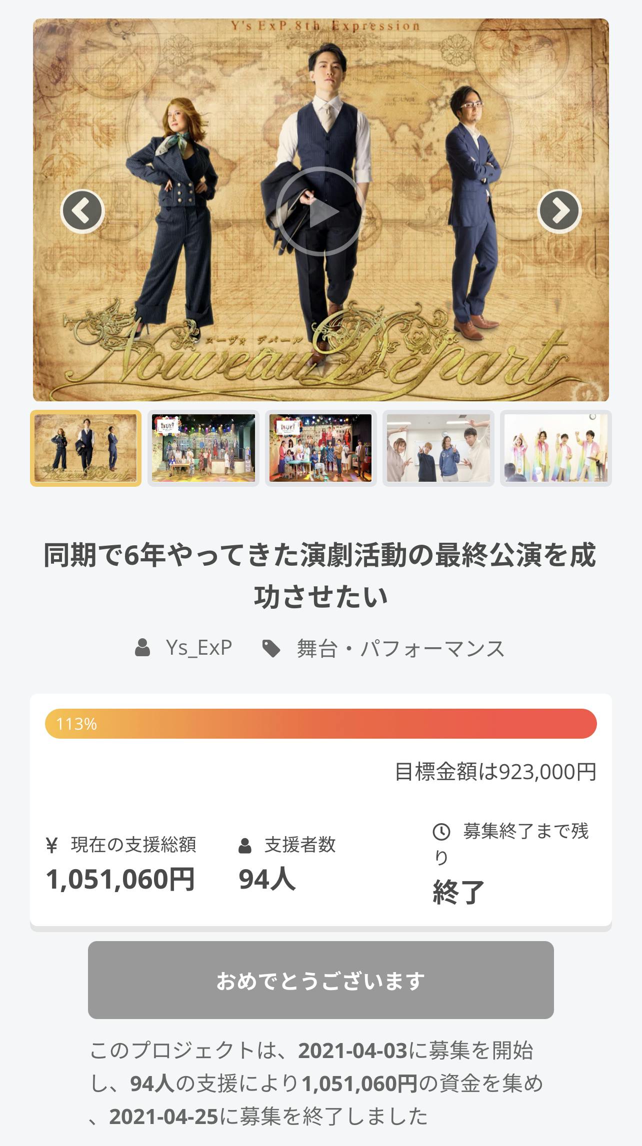 2021/04/26 11:36昨夜の24時をもってクラウドファンディングが終了しました!たった3週間という期間で、無謀なプロジェクトでしたが94名の方が応援してくれ、1,051,060円を支援してくださいました。達成率は前回のクラウドファンディングを超え、113%という結果です。これで、今回の配信公演の費用が賄えるだけでなく去年の公演中止による、大きな損失も賄うことができました。本当にありがとうございます!本番に向けてとても良い流れができたと思います。私たちは今、東京の緊急事態宣言の影響で急遽、1週間の稽古ができなくなってしまいました。本当は11日まで稽古場が使用できないので、2週間はできないのですが急いで埼玉県で稽古場を探し、数日抑えることができたので少ないダメージで済んでいます。しかし、これも延長となると厳しい戦いになります。無事に届けられるかどうかは、祈ることしかできませんが稽古の進捗としては、1ヶ月前にしてかなり進んでおり役者の皆さんの気概をひしひしと感じます。『なんとしても届けたい』その想いで進んでいくので、暖かく見守っていただけると嬉しいです。 もっと見る【達成!!!!】残り1日を残して100%を超えました!