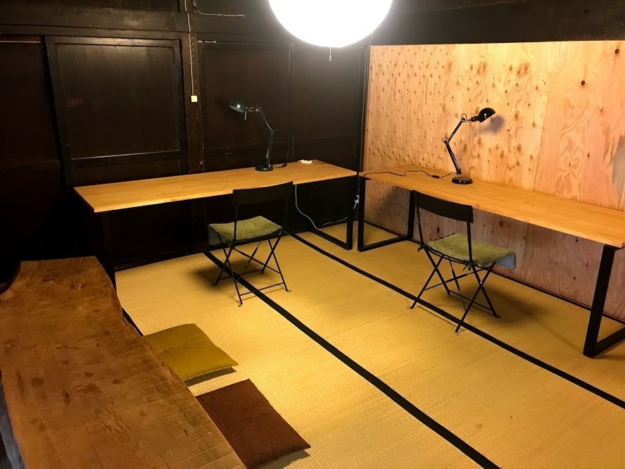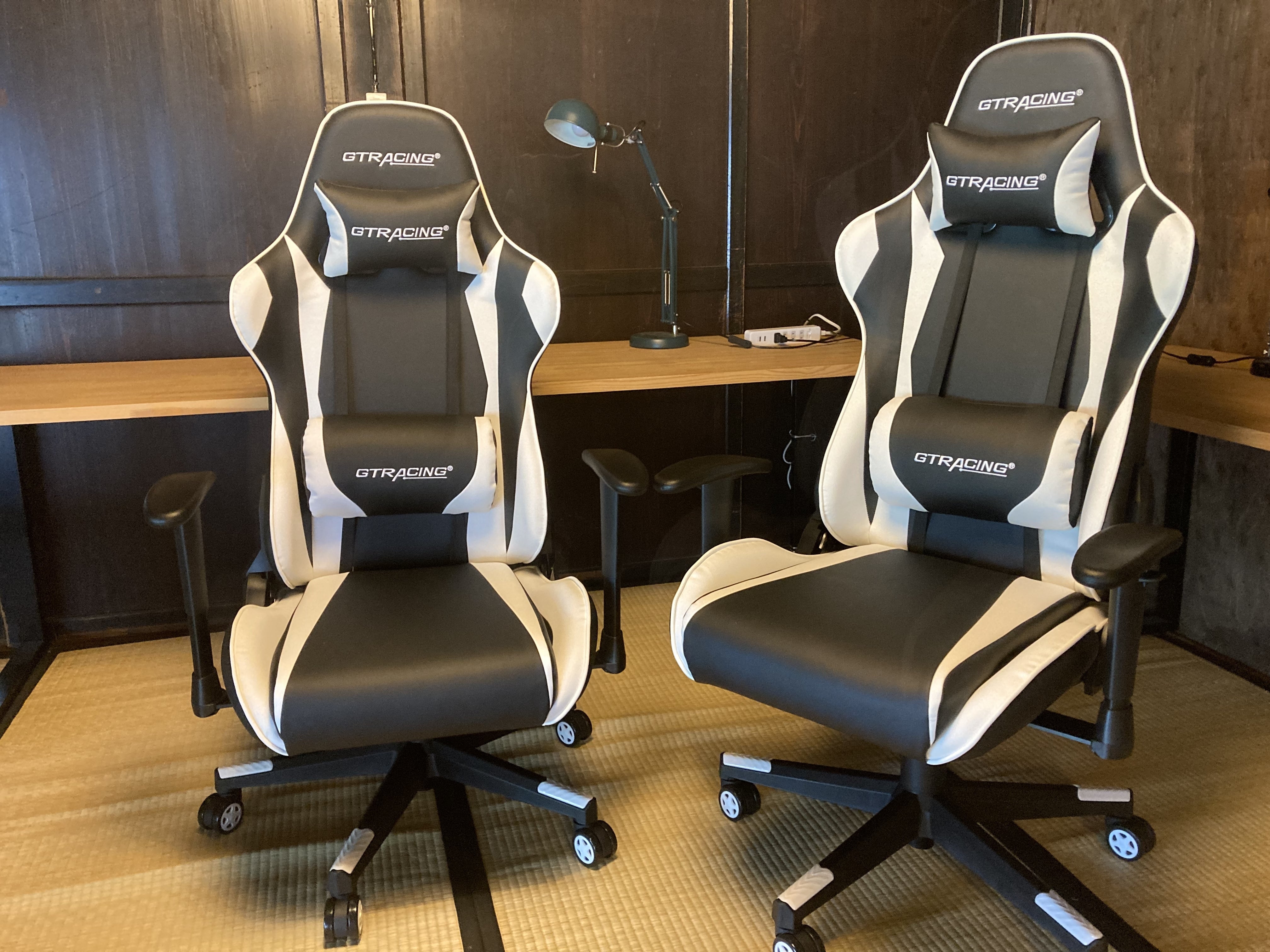 古民家宿内に作られたワーケーション用のワークスペースに、ゲーミングチェアを2台設置し、長時間のデスクワークでも快適に作業できる環境を作ります。